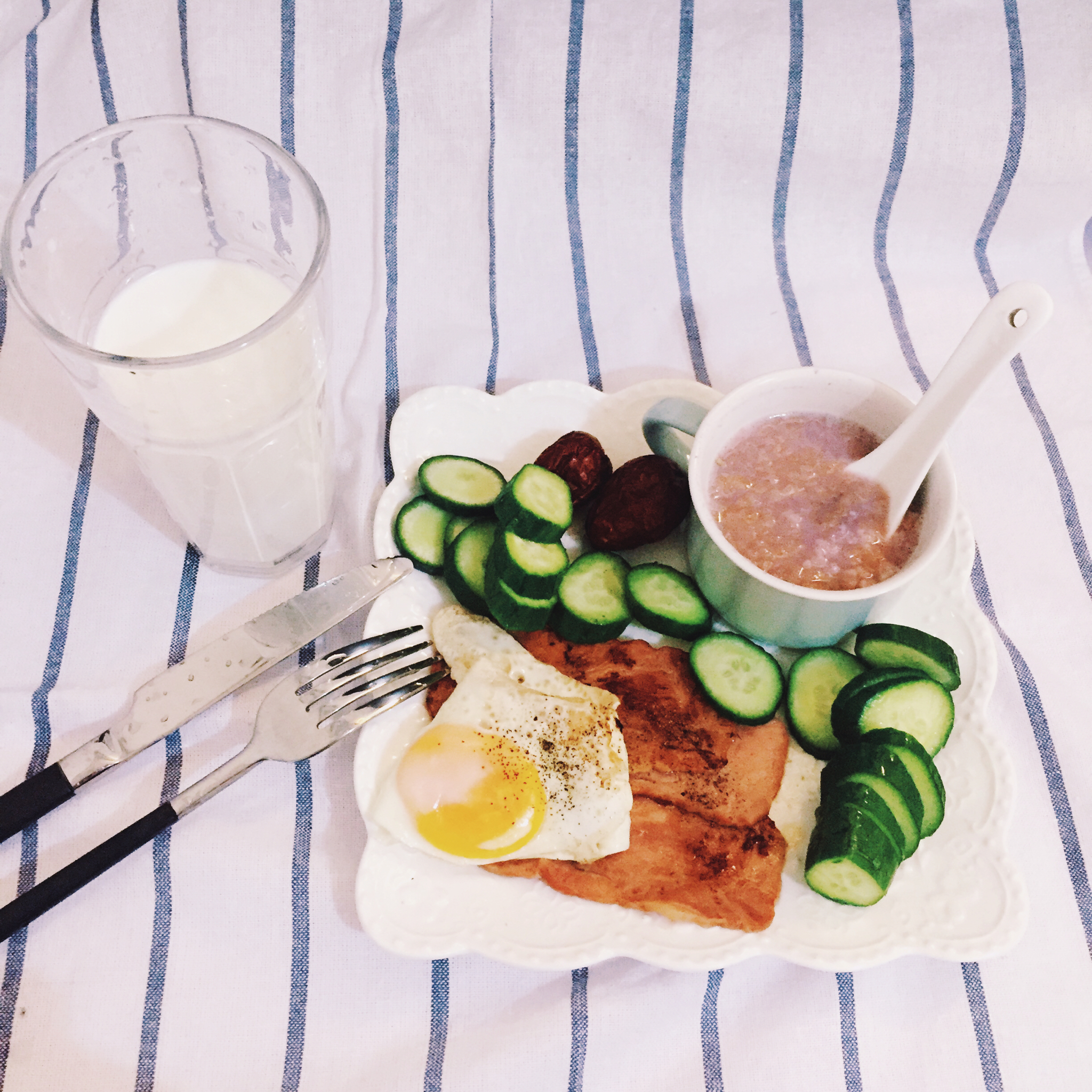 吃早餐前运动了30分钟,拉伸10分钟。然后边洗澡边做了个面膜。
