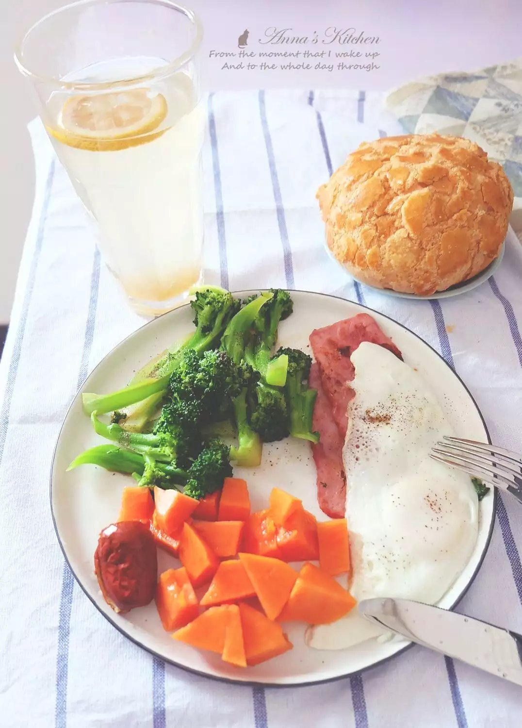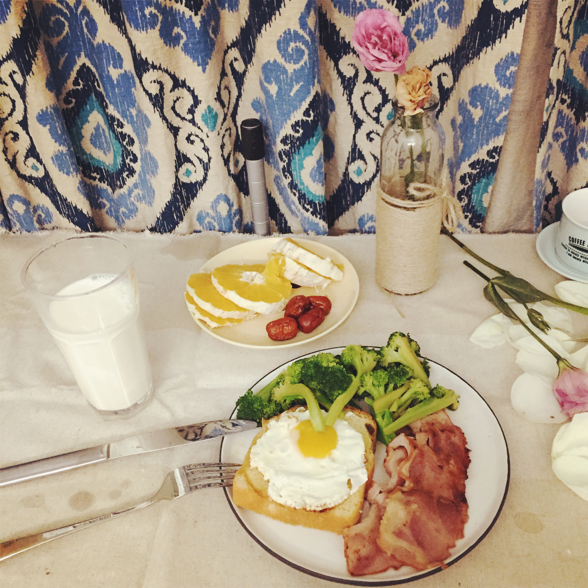 培根,鸡蛋,西兰花,只加盐调味。配一杯纯牛奶,低脂的。