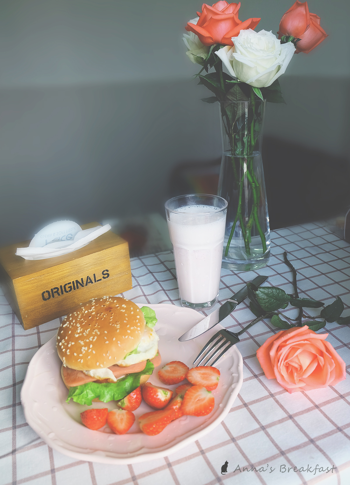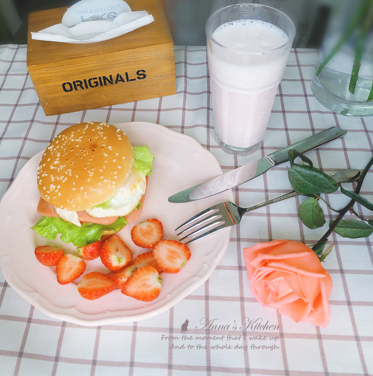 来个汉堡三明治。火腿2片,番茄一片,溏心煎蛋一个,~来杯草莓奶昔~~圆满!