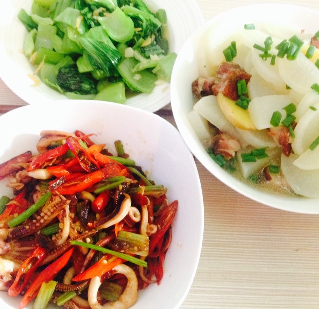 辣炒鱿鱼+腊排骨煮白萝卜+虾皮鱼露炒芥菜