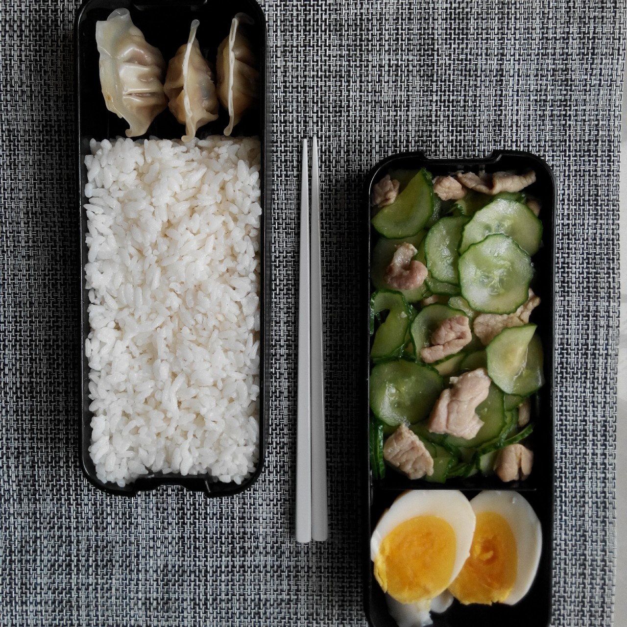 白煮蛋 青瓜炒肉片 蒸饺 米饭