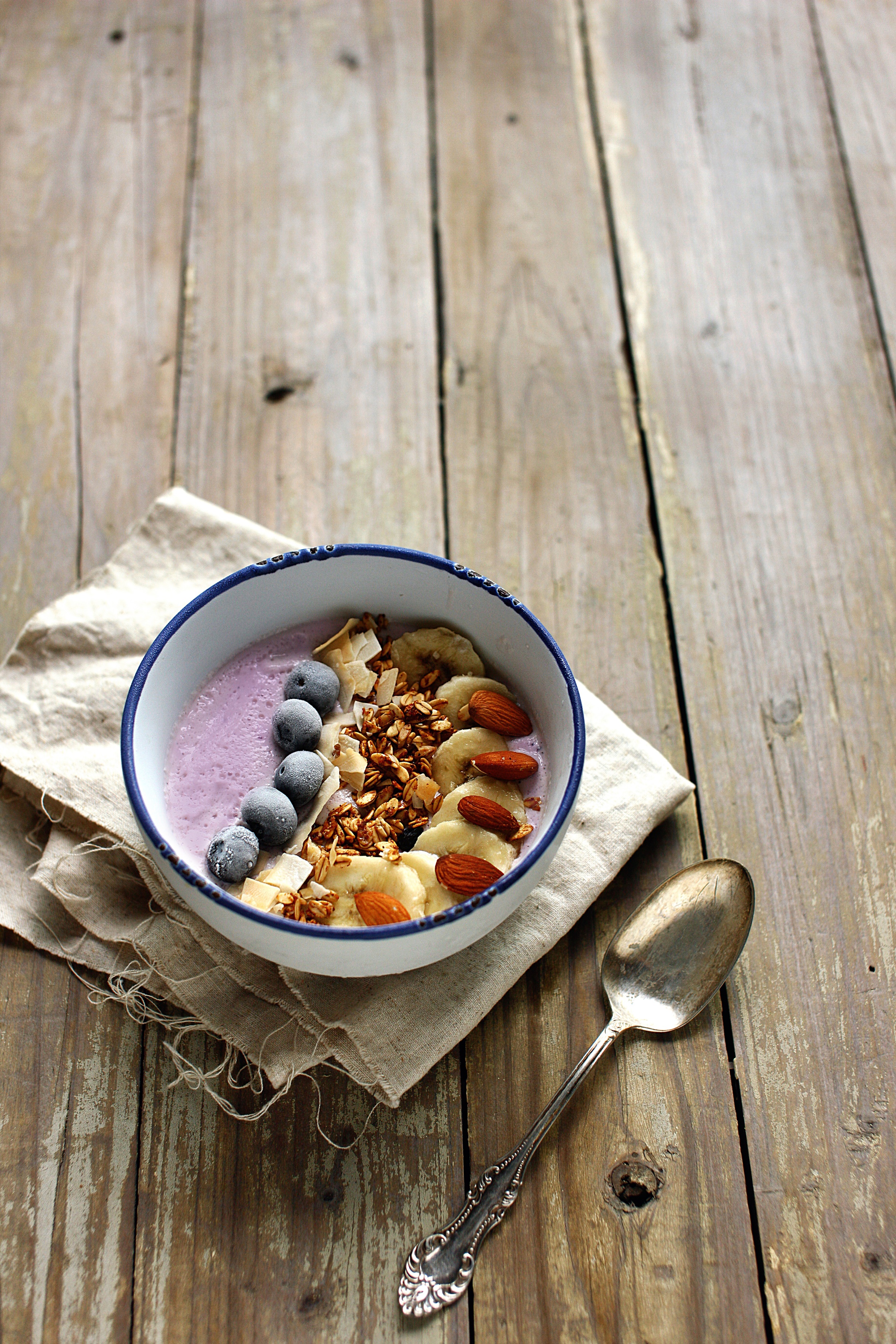 蓝莓里海,下面是燕麦麸,香蕉椰片蓝莓杏仁格兰诺拉,