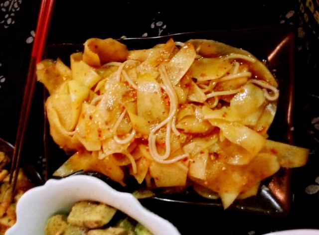 土豆用削皮刀削薄片,热水过,冷水过,加点米粉,用事先弄好的辣椒酱拌匀。
