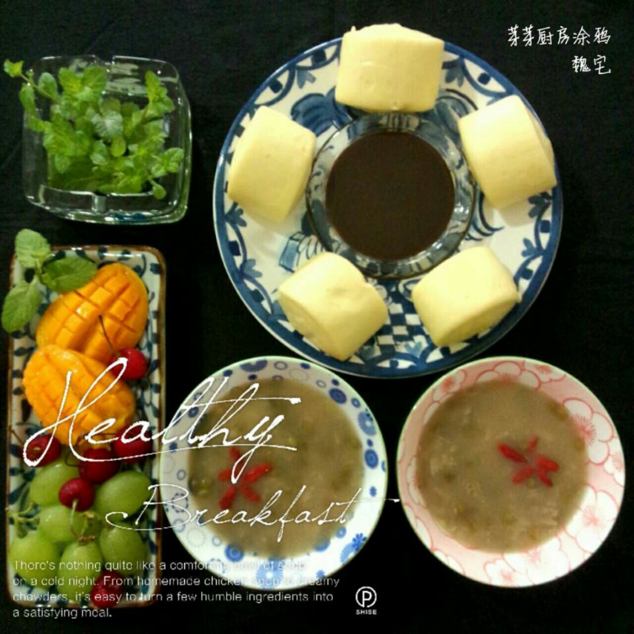 是日早餐:百合绿豆糯米粥,玉米面小刀切+巧克力炼乳,水果!