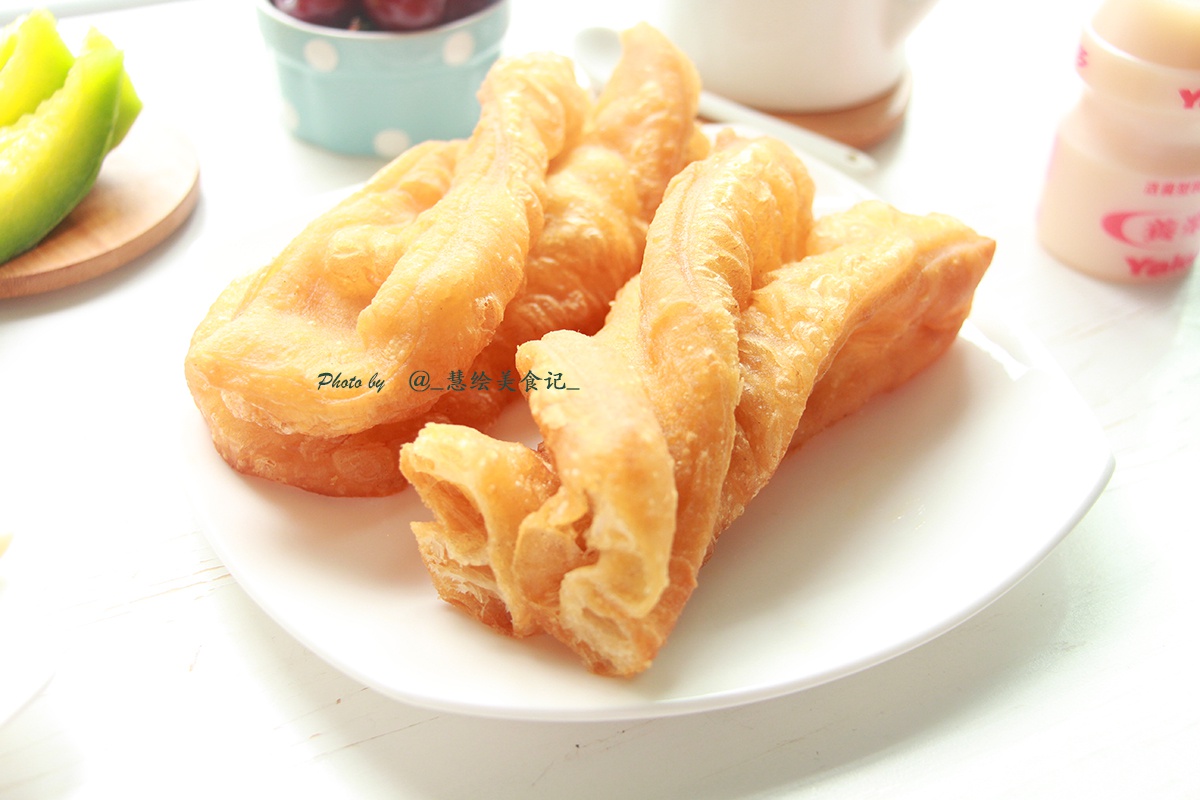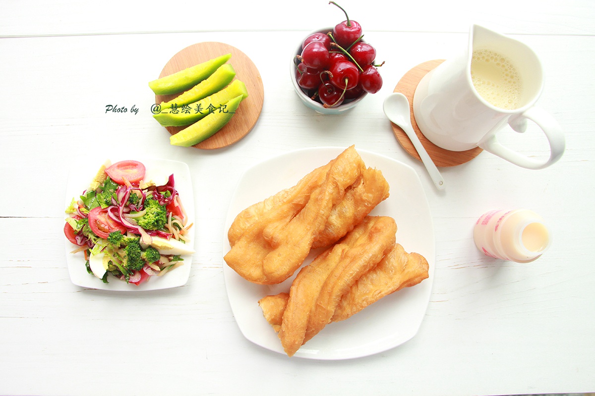 假期早午餐~ 周二早餐~ 清水咸油条、凉拌菜、豆浆,搭配樱桃、甜瓜、养乐多~~