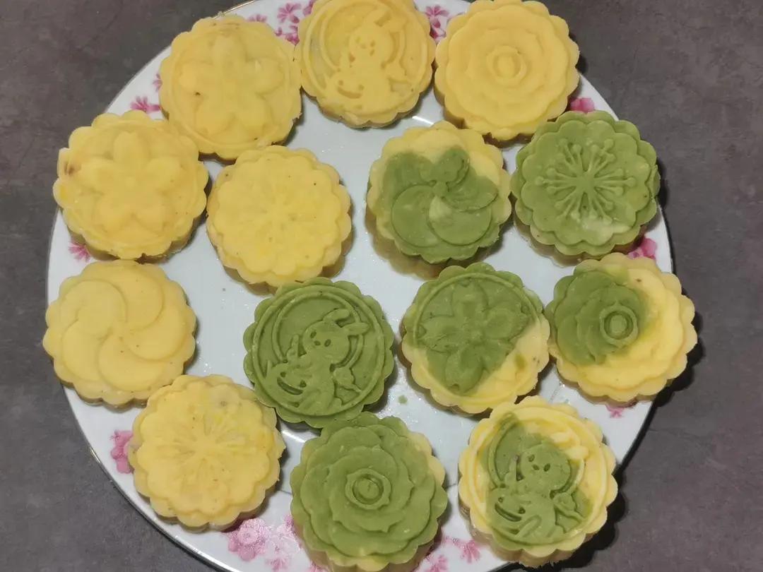 300g脱皮绿豆电饭煲蒸熟,分2次绞肉机打泥,200g+35黄油+35g 糖, 100g+玉米油7g+糖10g,第一次做...