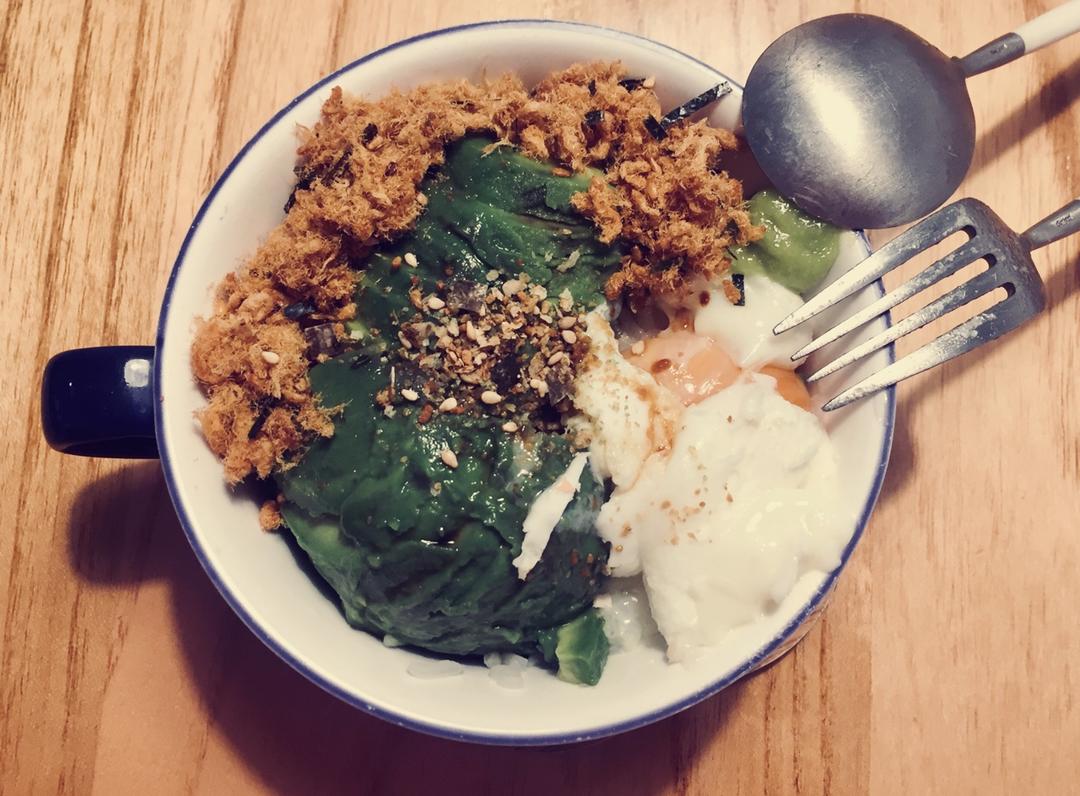 半个牛油果一个鸡蛋两大勺海苔芝麻肉松 一点芥末酱油和...