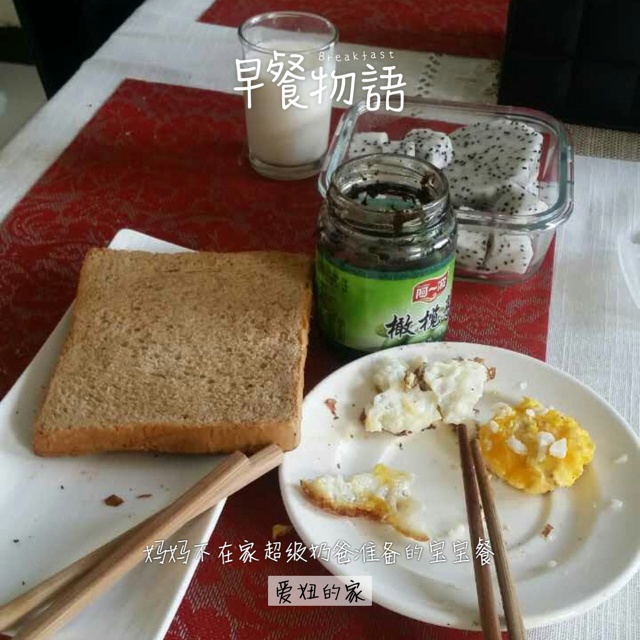 妈妈不在家爸爸秒变超级奶爸:爸爸准备的爱心早餐:全麦吐司+煎鸡蛋+橄榄菜+牛奶+火龙果!盘子是昨天洗完放明面上的,吐司和...
