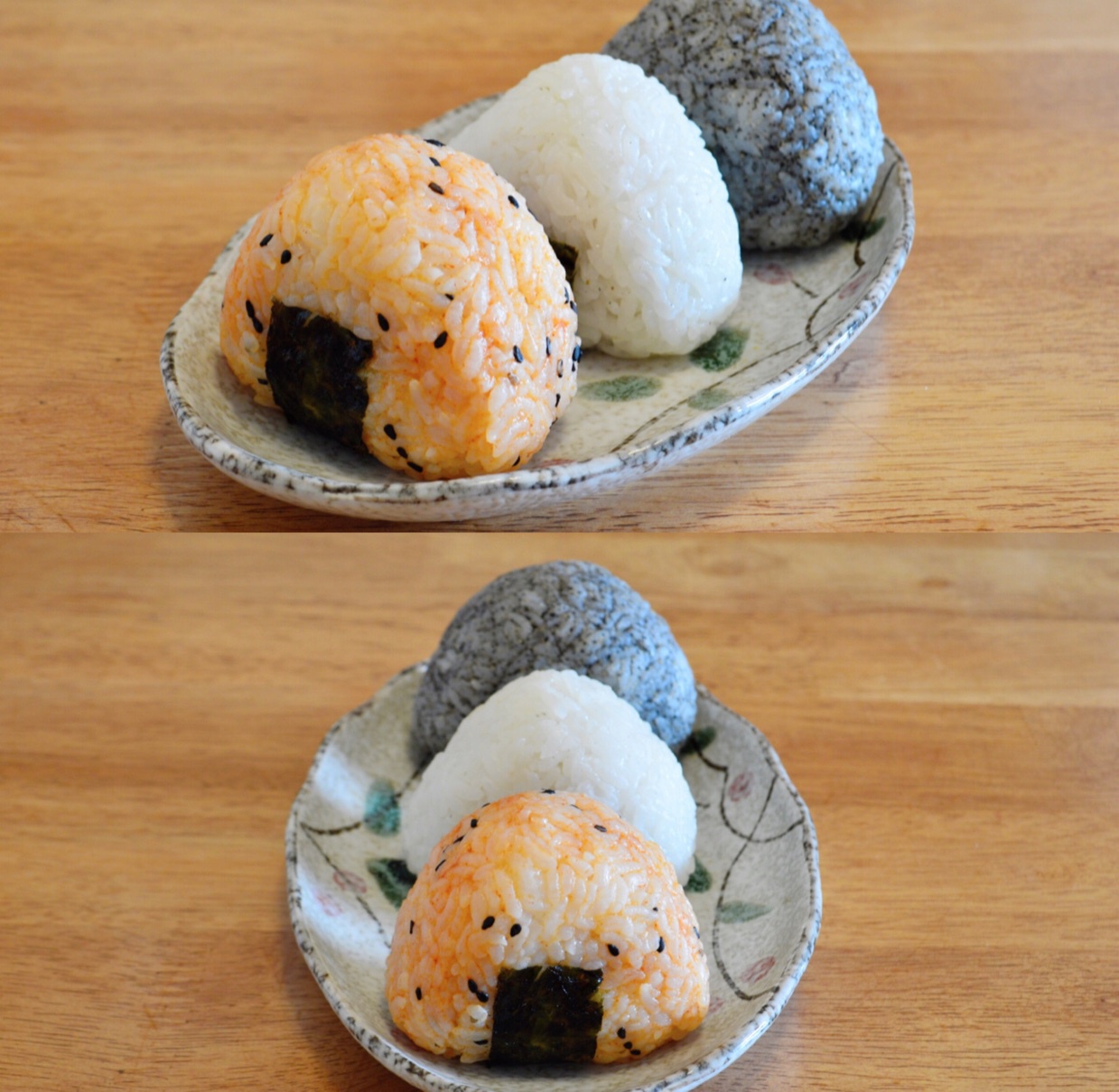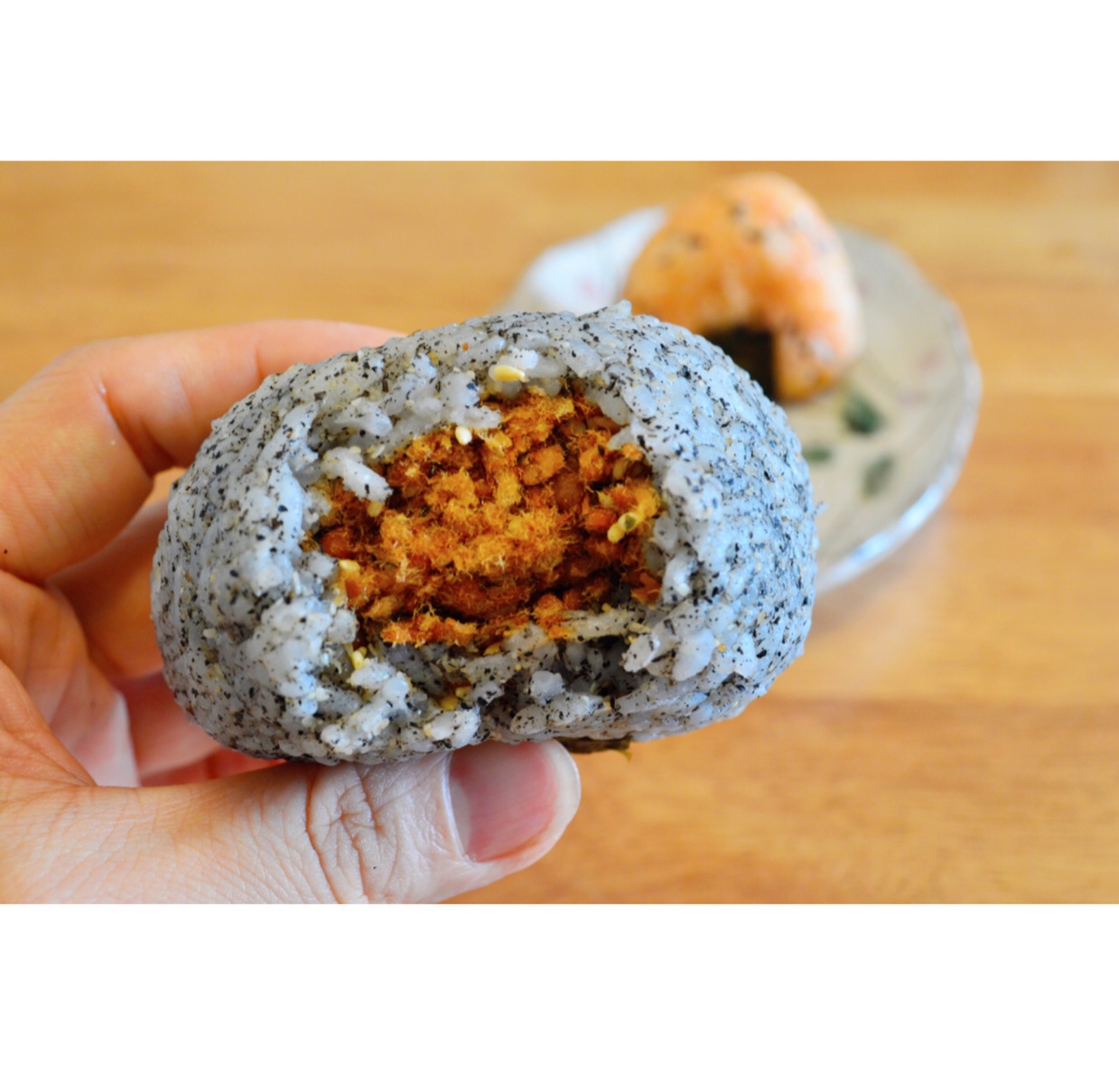 冰棒唆完了,捏几个饭团吃一吃,海苔肉松馅儿的,米饭分别是拌饭酱的,原味的和黑芝麻粉的