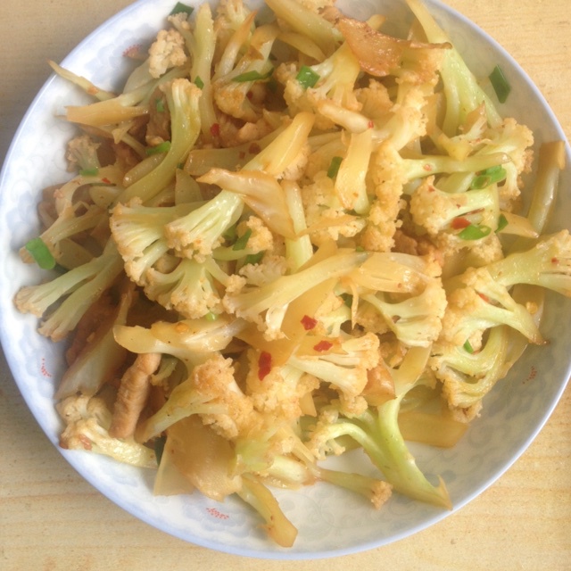 4炒到花菜熟9分的时候撒葱出锅