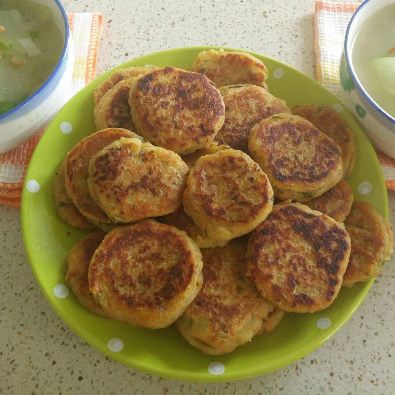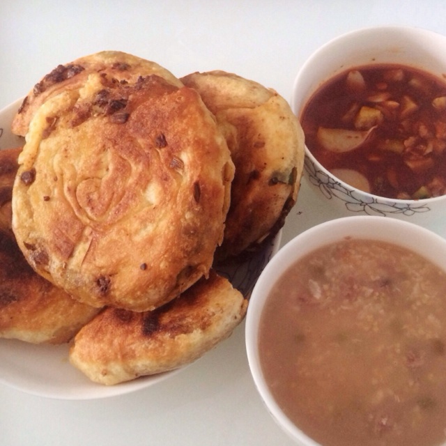 麻辣馅饼搭绿豆小米粥,剩下的一点拌黄瓜,很配
