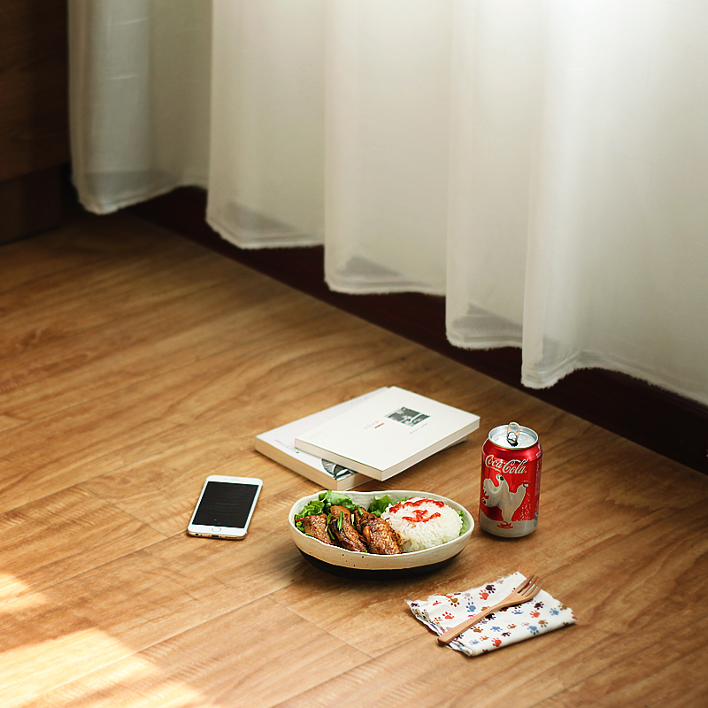 坐在地板上吃韩式辣酱鸡翅