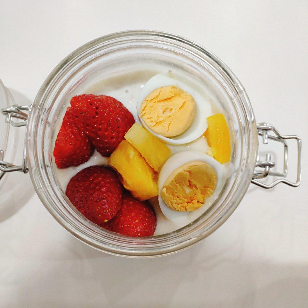 隔夜酸奶燕麦,配上草莓和菠萝,再加一颗鸡蛋