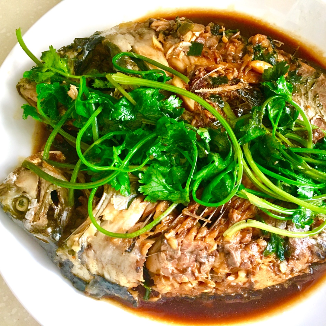 口味很棒,但因为技术不娴熟煎鱼的时候有点失败,鱼皮破坏了也有点散、希望下次更好!香菜跟红烧鱼真是绝配。 #午餐•2016...