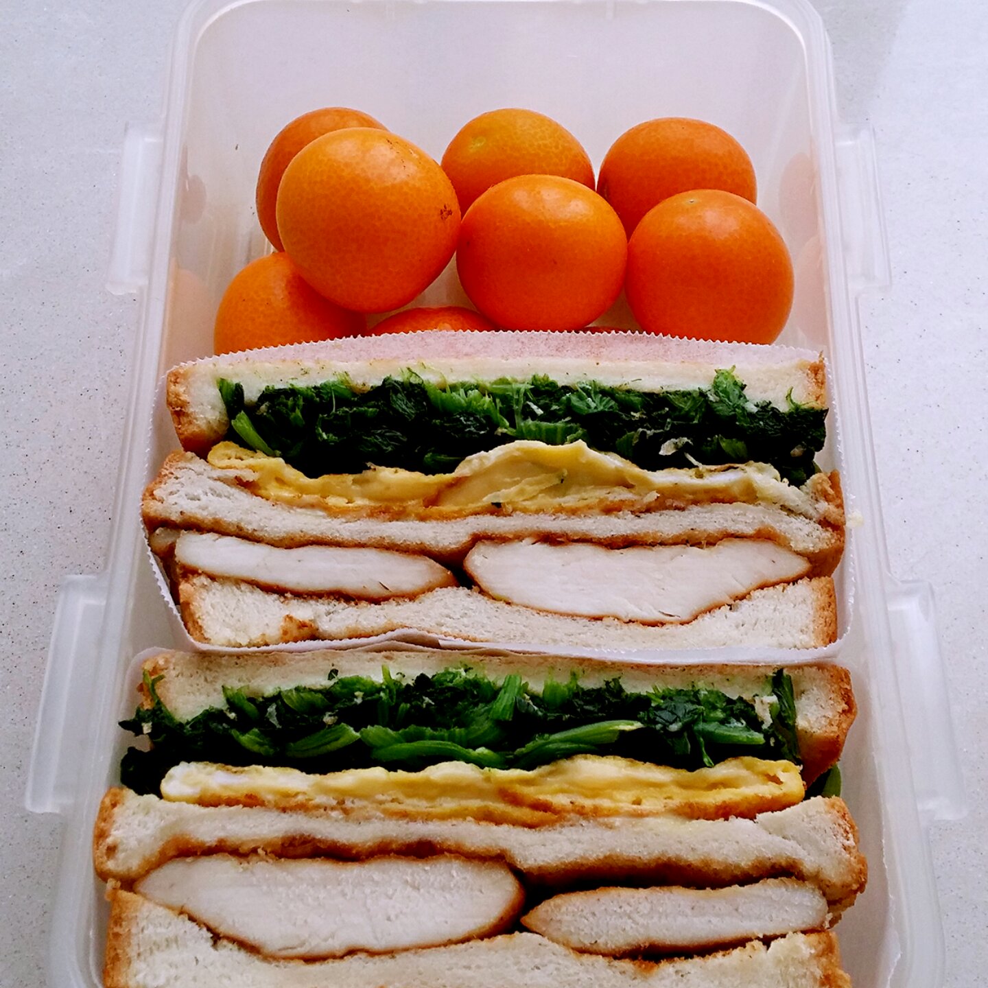 今天中午吃三明治,一层菠菜和芝士煎蛋,一层是香蒜蜂蜜煎鸡胸...