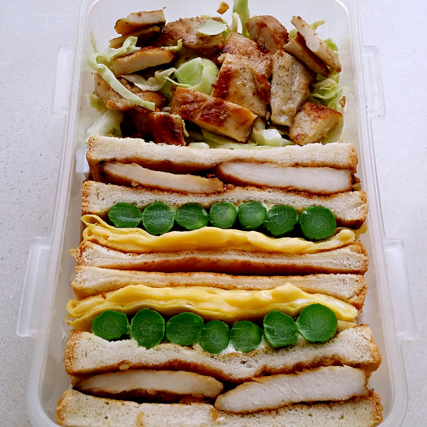 继续三明治,一层是香蒜蜂蜜煎鸡胸肉,一层是芝士煎蛋加芦笋...