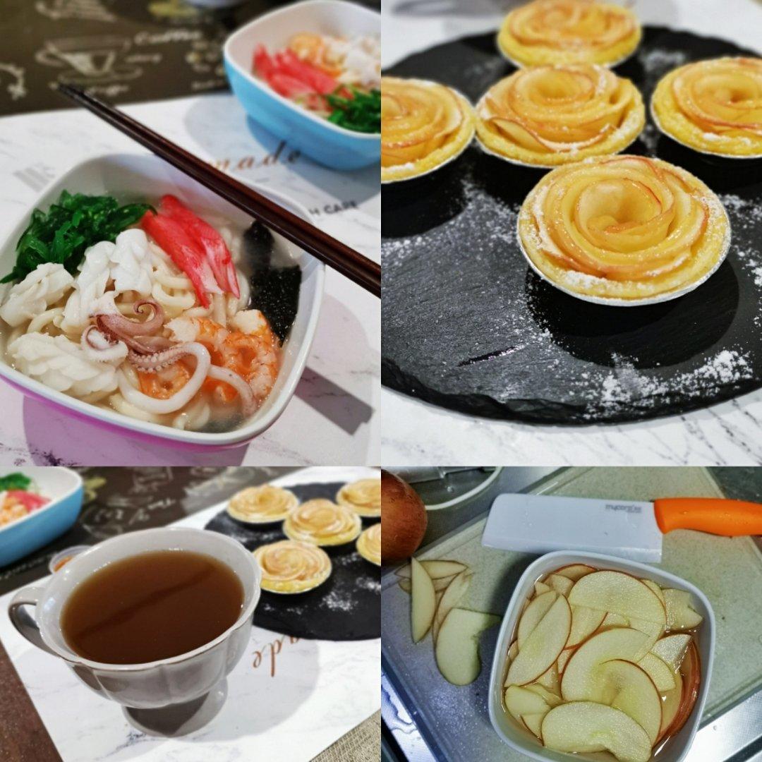 海鲜汤乌冬,苹果挞,黑糖姜枣茶