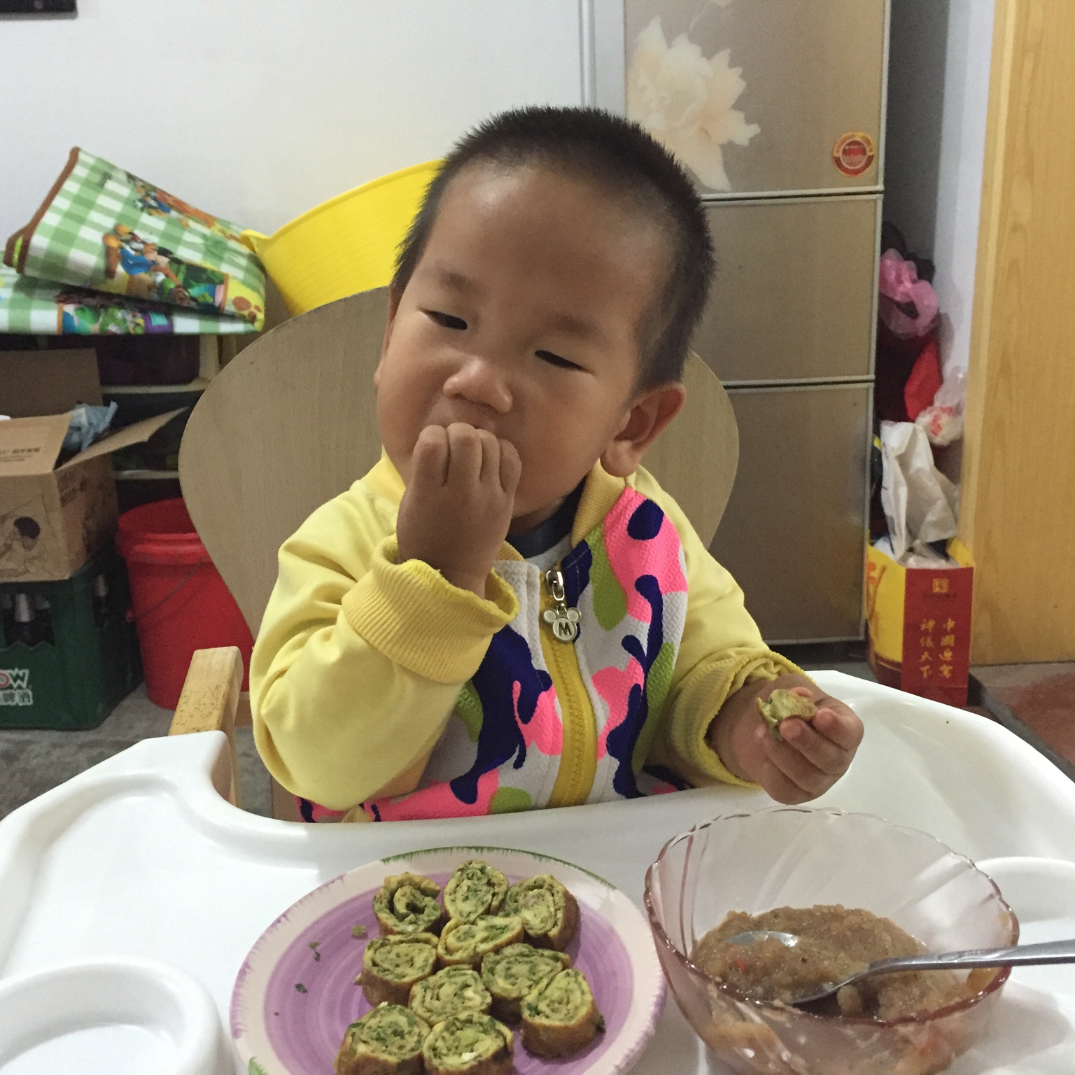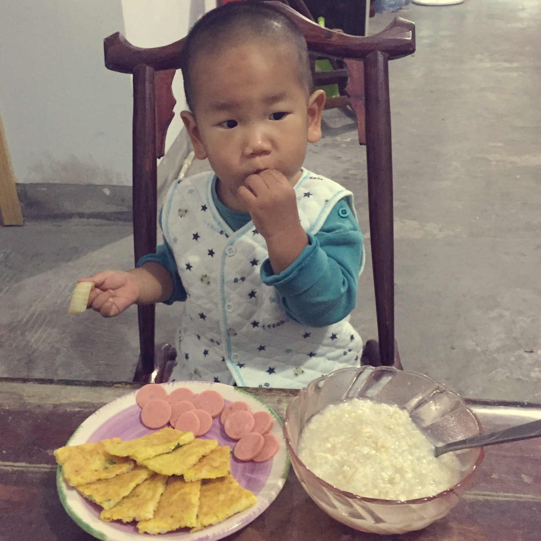 配方奶180ml+燕麦糯米粥+鸡蛋米老头+小香肠……粥和香肠吃完了,米老头他也不爱!