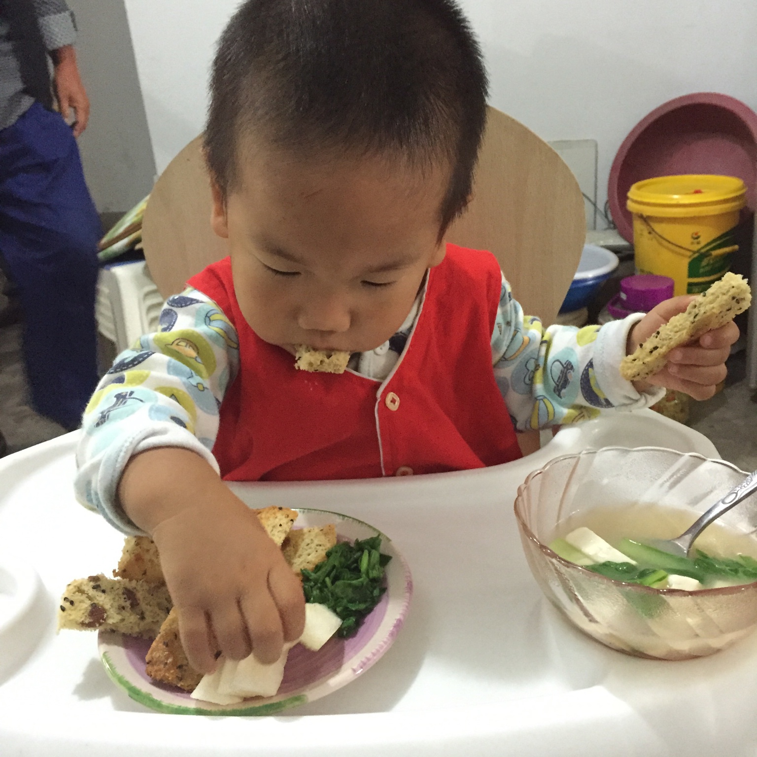 配方奶+提子吐司+鱼头豆腐青菜汤……昨天不吃的豆腐今天大口大口吃
