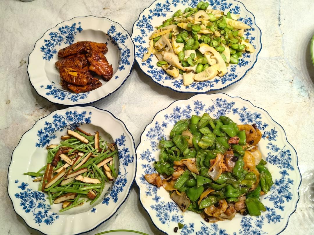 开学季,第一波春菜🎋,什锦牛肉粒,清炒豌豆尖,笋尖羊肚菌鸡汤。
