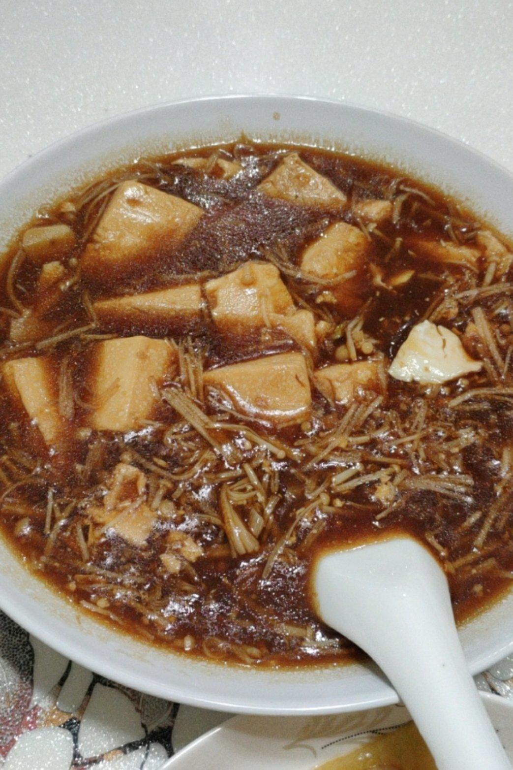 嫩豆腐煮金针菇,娃超喜欢吃,如果能吃点辣的很棒了。内酯豆腐一盒金针菇一把,生抽老抽耗油,起锅前放点勾芡,完美出锅#家常菜...