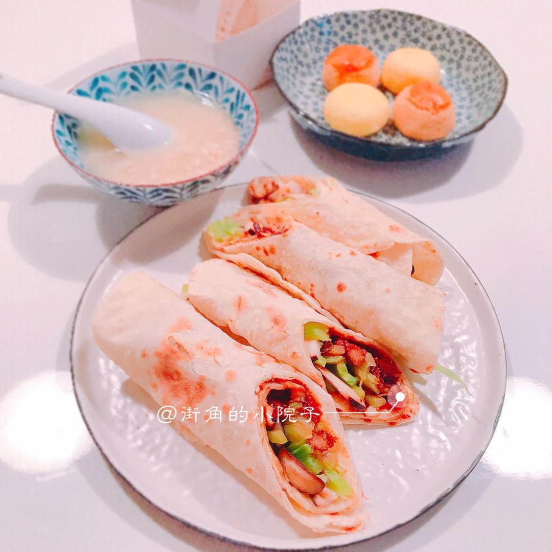早餐是~燕麦酱肉饼卷 燕麦粥 奶黄饼和甘露酥 外面风沙太大了 老实呆在室内吧哈哈哈