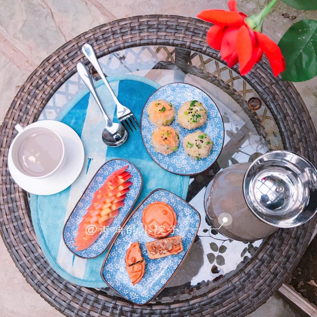 今日早餐 肉松香葱饭团 苹果片 我们新口味的月饼 黑豆豆浆~