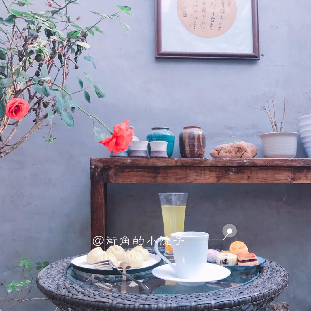 小院子里的早餐,小笼包,什锦谷物米糊,百香果茶,当然还有街角的甜点啦