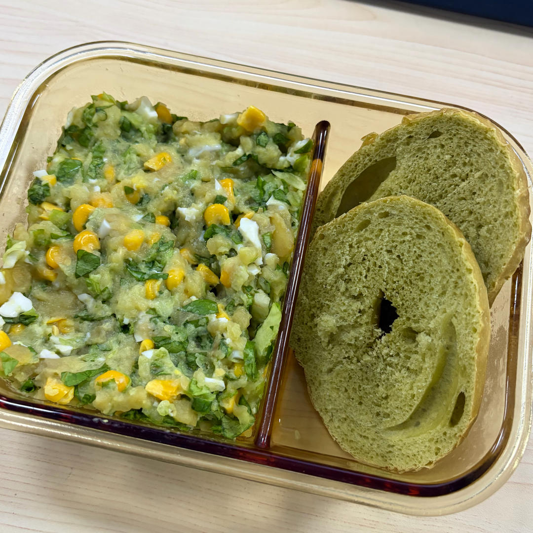 今日份午餐:黑芝麻碱水贝果+红焖春笋+西芹香干+一颗卤蛋。