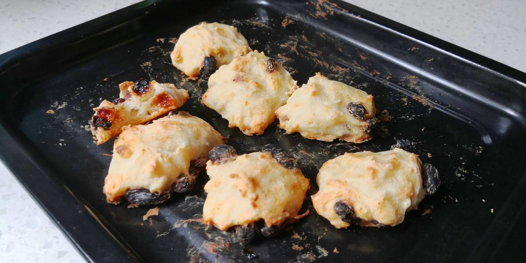 160度 17分钟,黄油软化不够,也可能是因为葡萄干没有提前浸泡,面糊偏硬了
