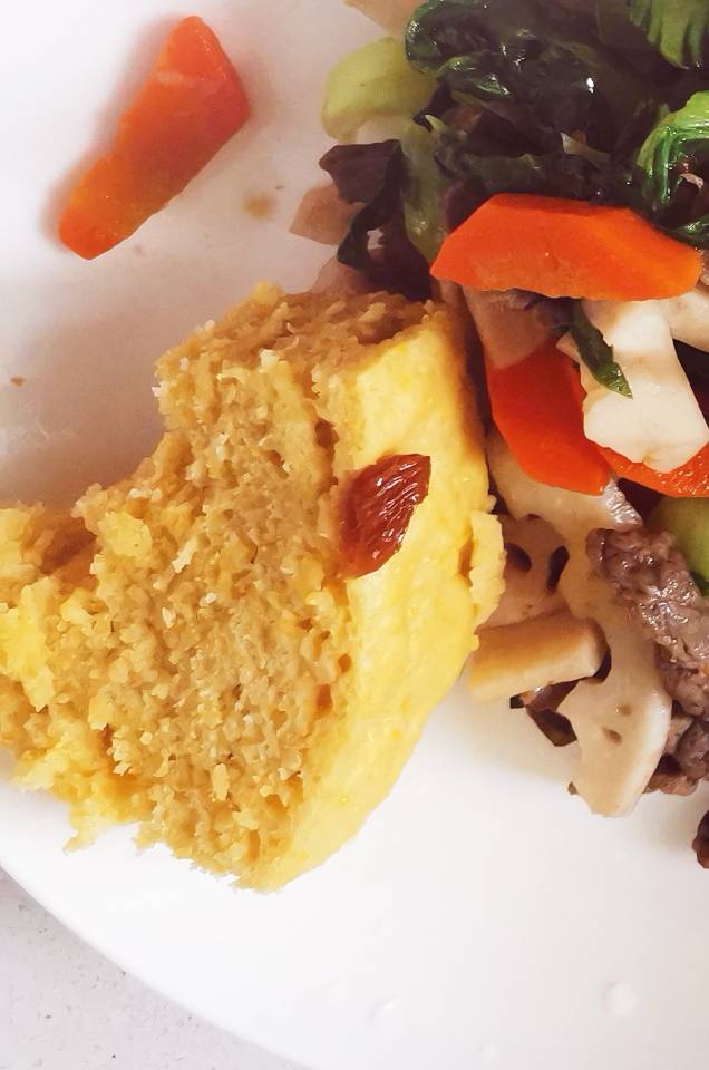 #发糕# 玉米面发糕,两种面都多了十几克,水放多了些,达到流动状。用了两个四寸的模具+一个饭碗,七分满。孩子爱吃。