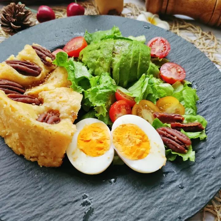 75g(黑芝麻核桃玉米碎黑米大米)辅食米糊+蒸南瓜,1勺一段奶粉,100g面粉?宝宝9个月辅食,除了酵母没加其它,成品香...