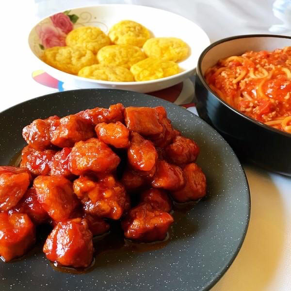 用的番茄沙司,凭感觉放的糖和醋,醋放的比较少,还放了鹌鹑蛋,味道不错,棒棒的,樱桃肉,解锁