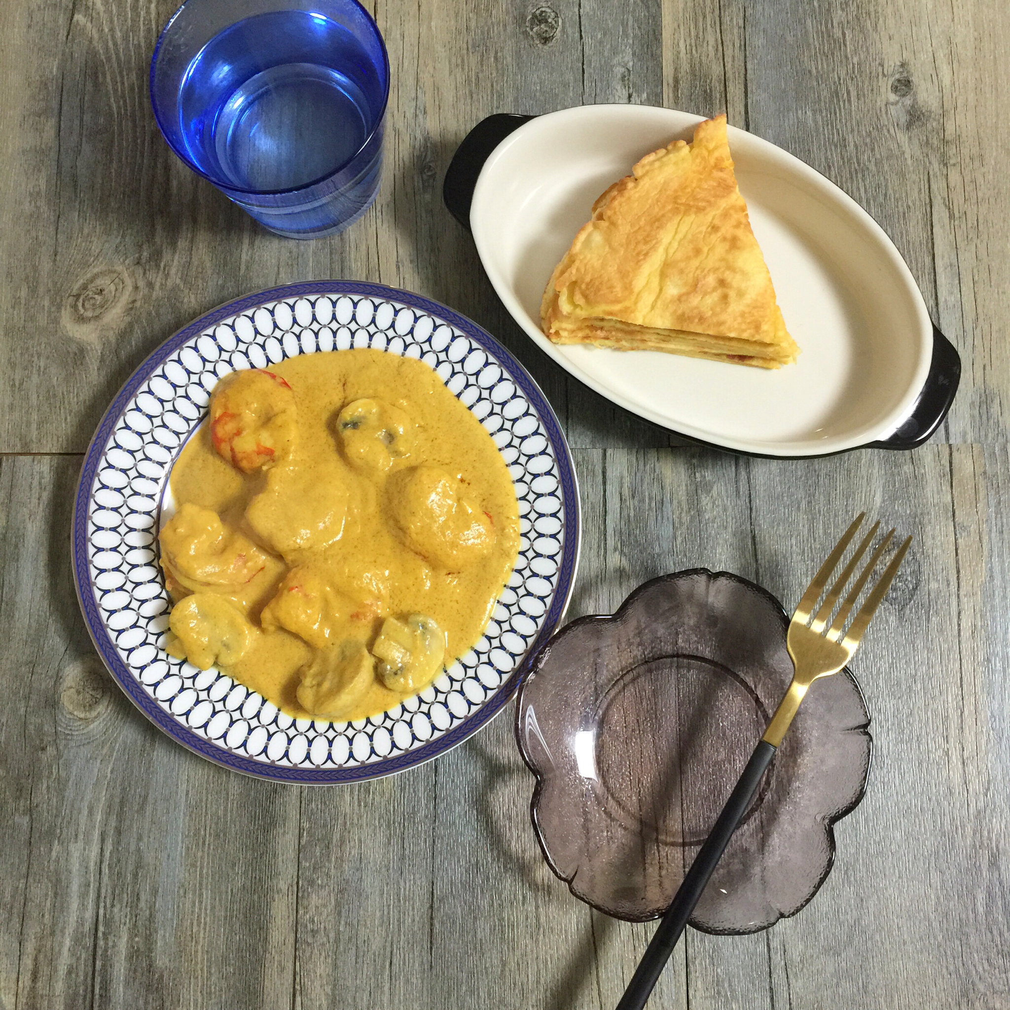 咖喱虾、鸡蛋面饼