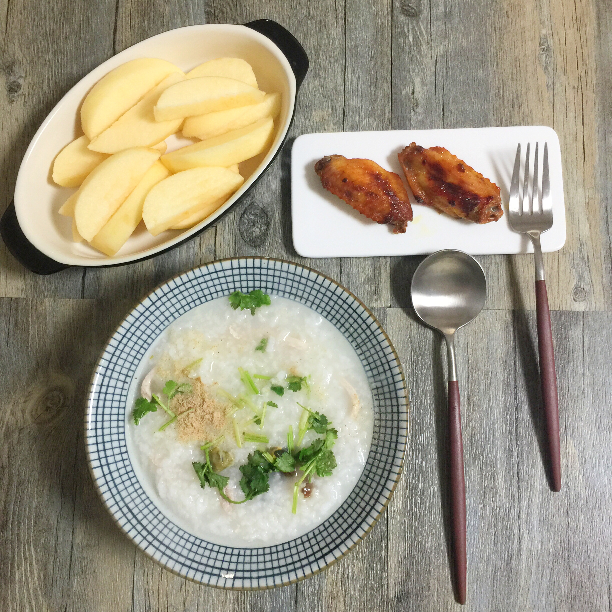 皮蛋瘦肉粥、鸡翅、苹果
