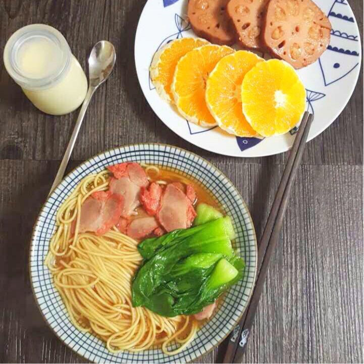 叉烧拉面、糯米藕、水果、布丁