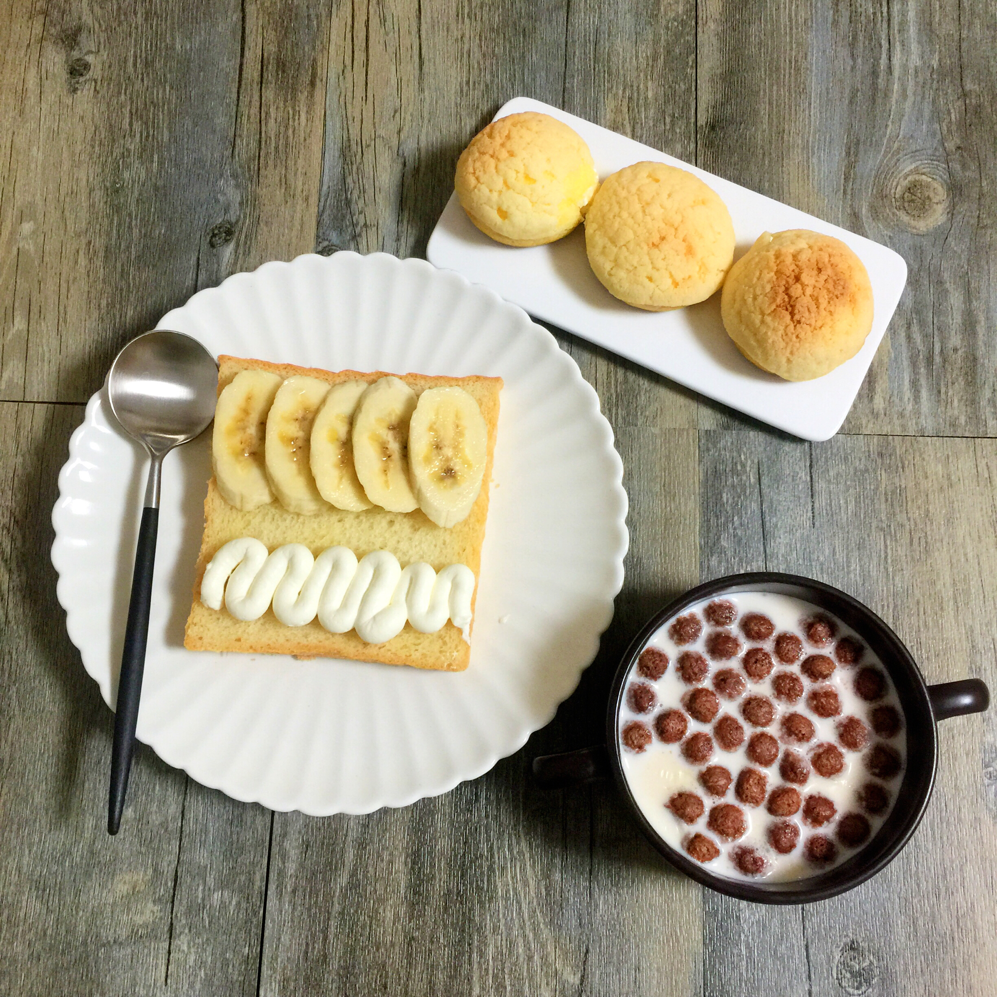 香蕉吐司、泡芙、牛奶