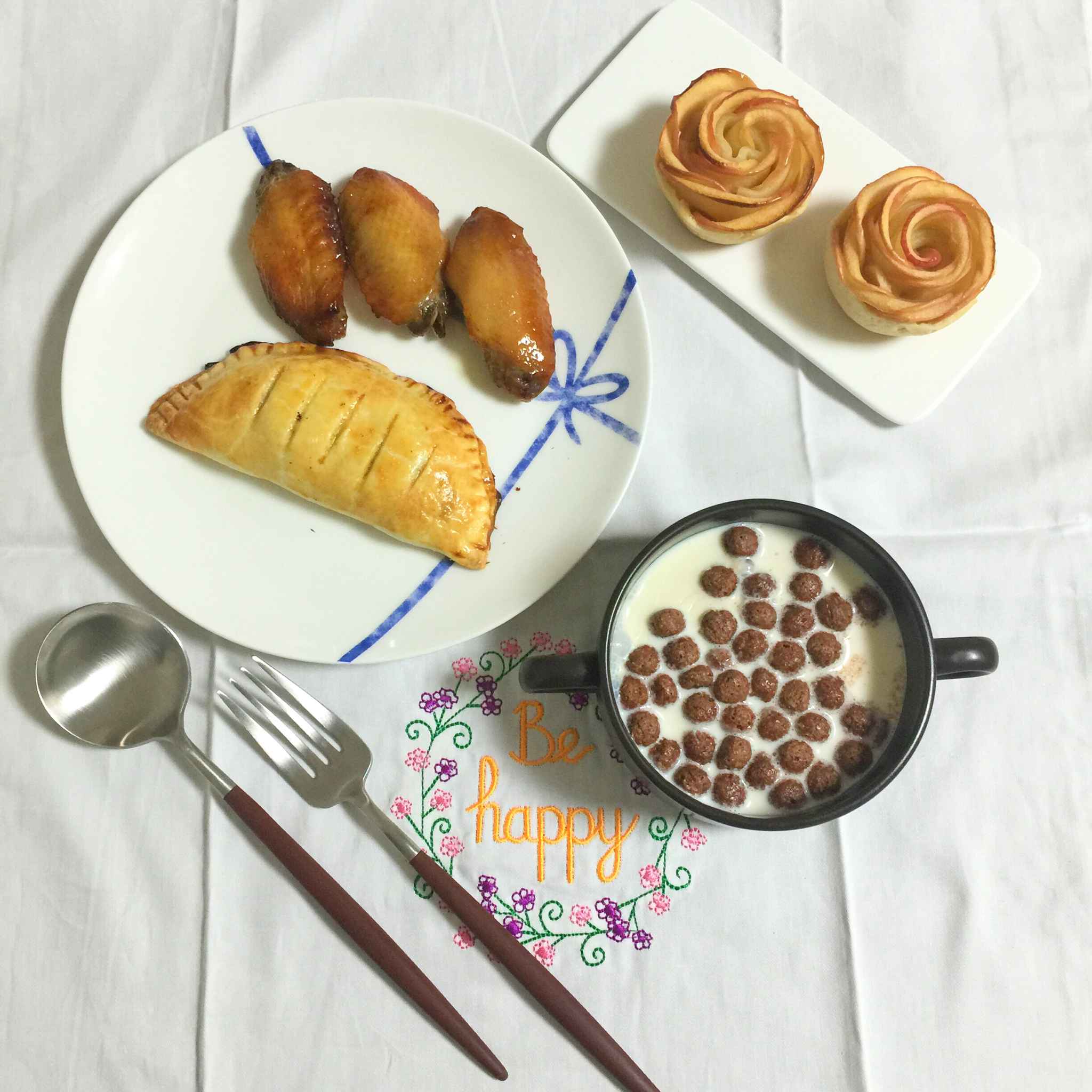 玫瑰苹果派、香蕉派、烤鸡翅、牛奶