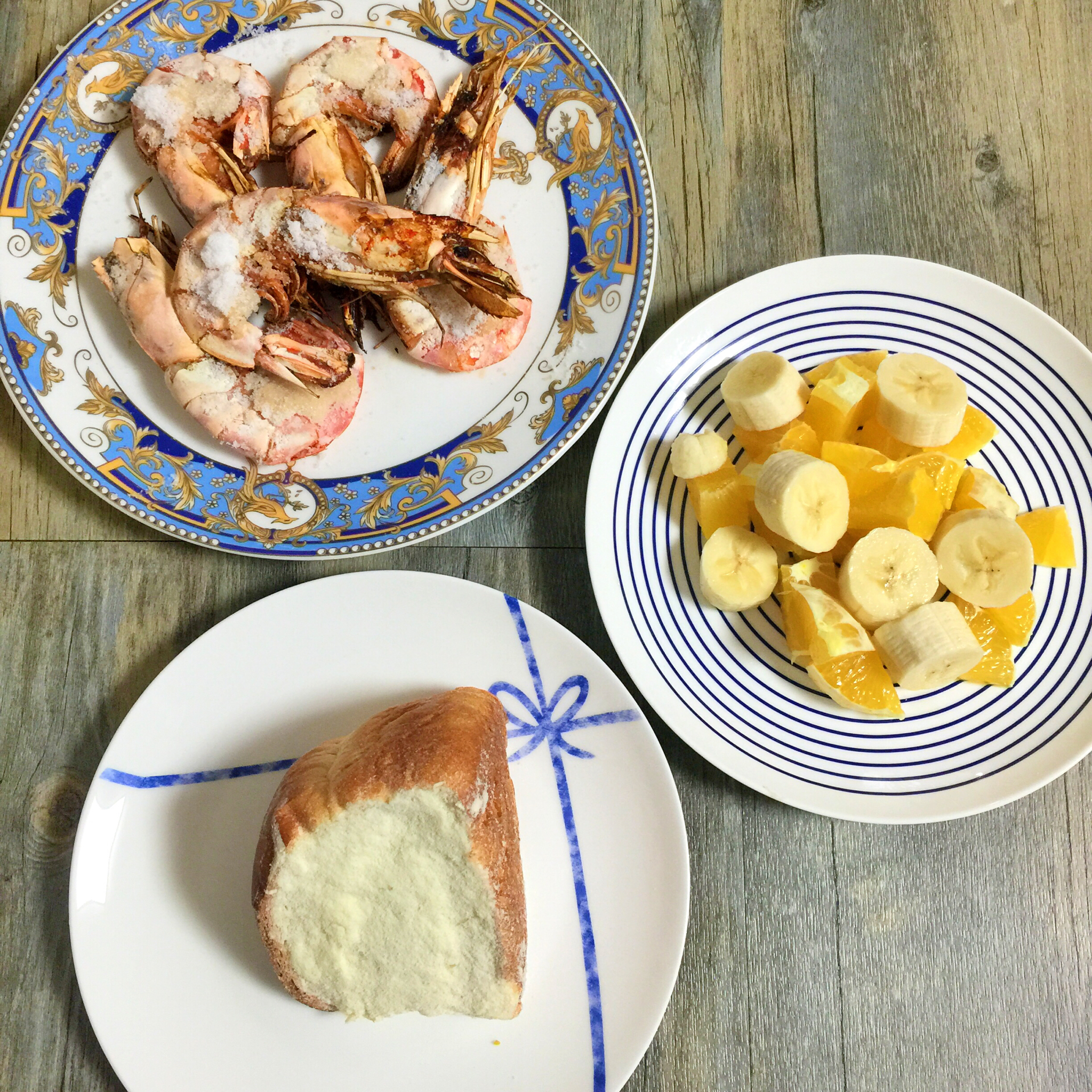 盐焗对虾、乳酪包、水果色拉