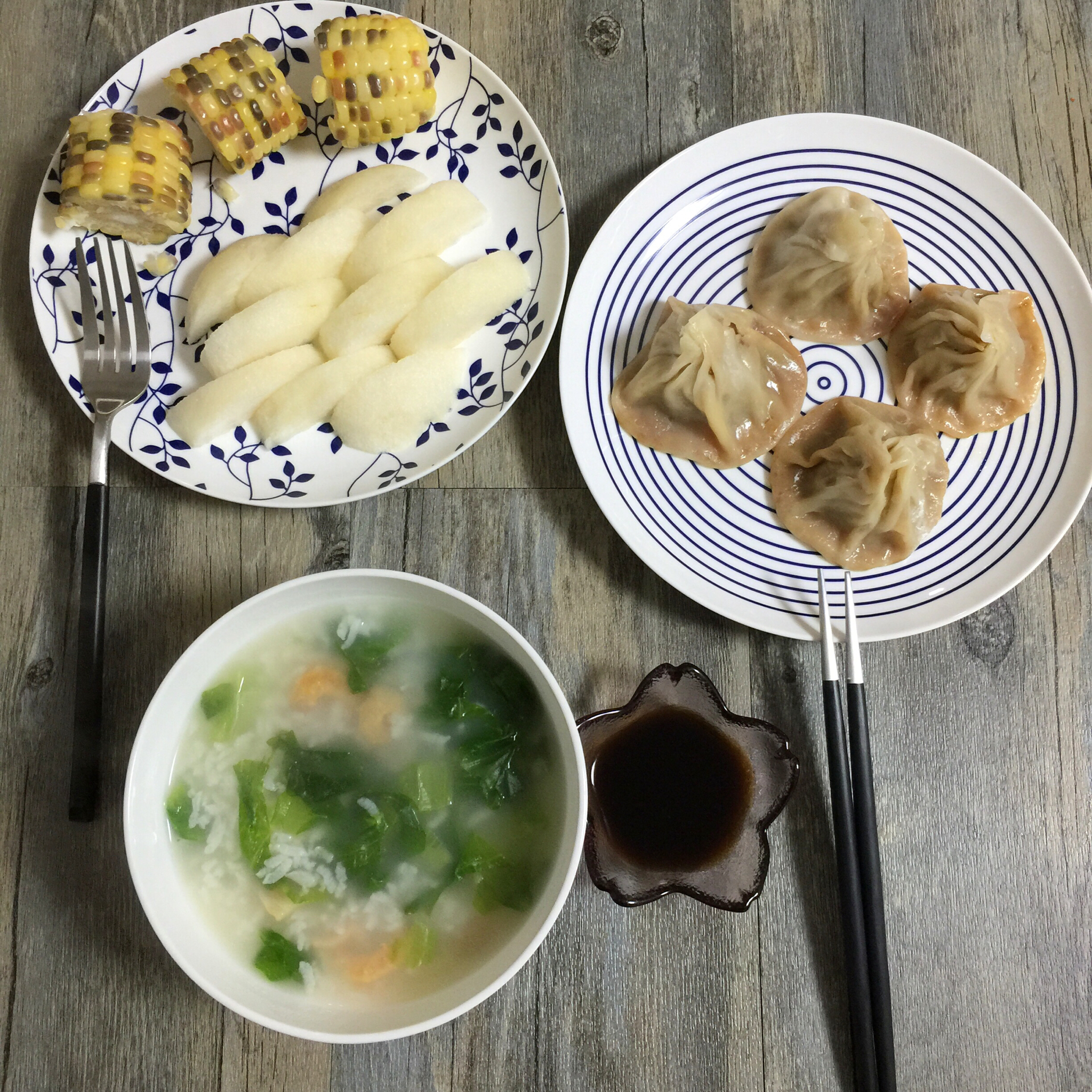 干贝虾仁菜粥、小笼包、玉米、水果