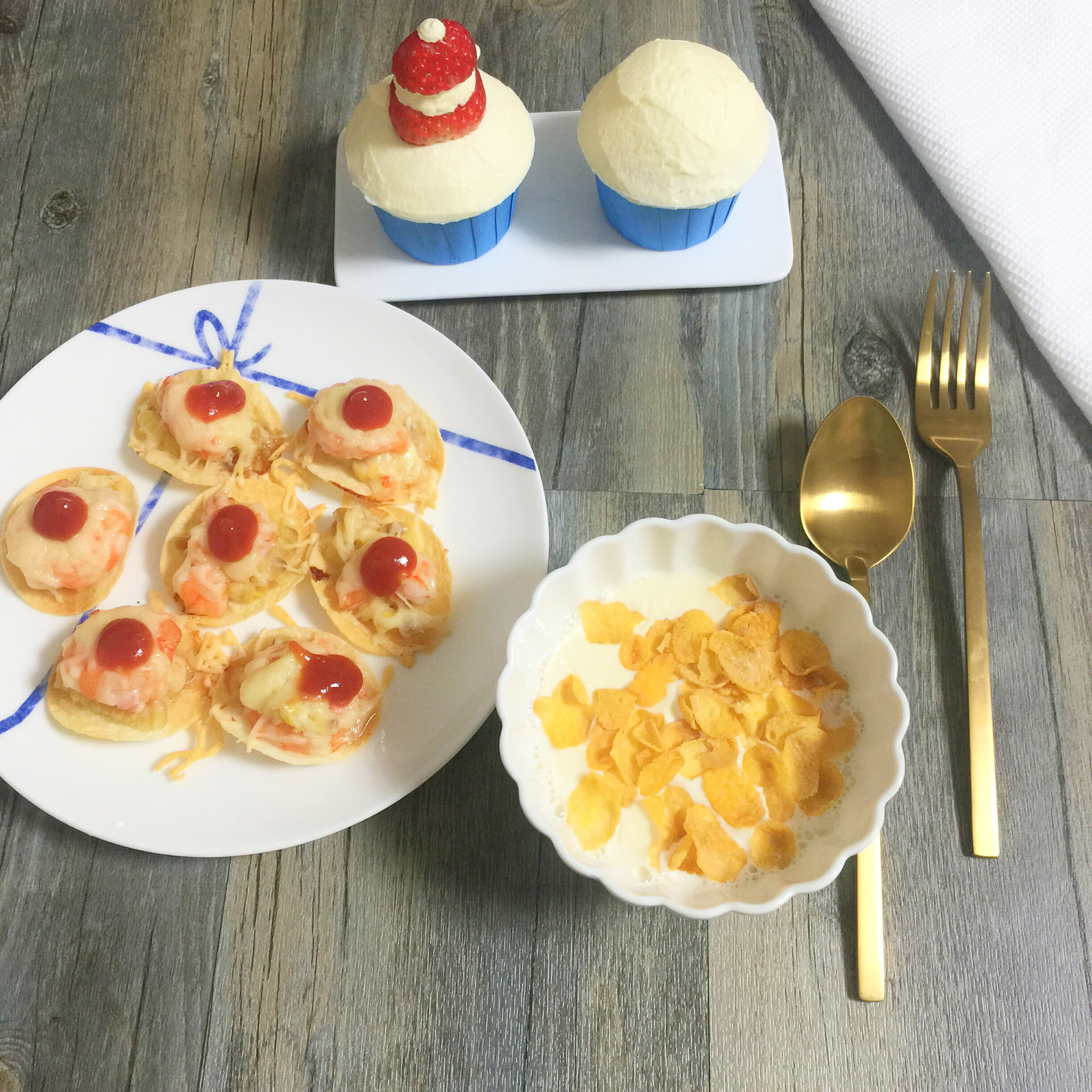 玉米芝士虾盏、麦片牛奶、杯子蛋糕