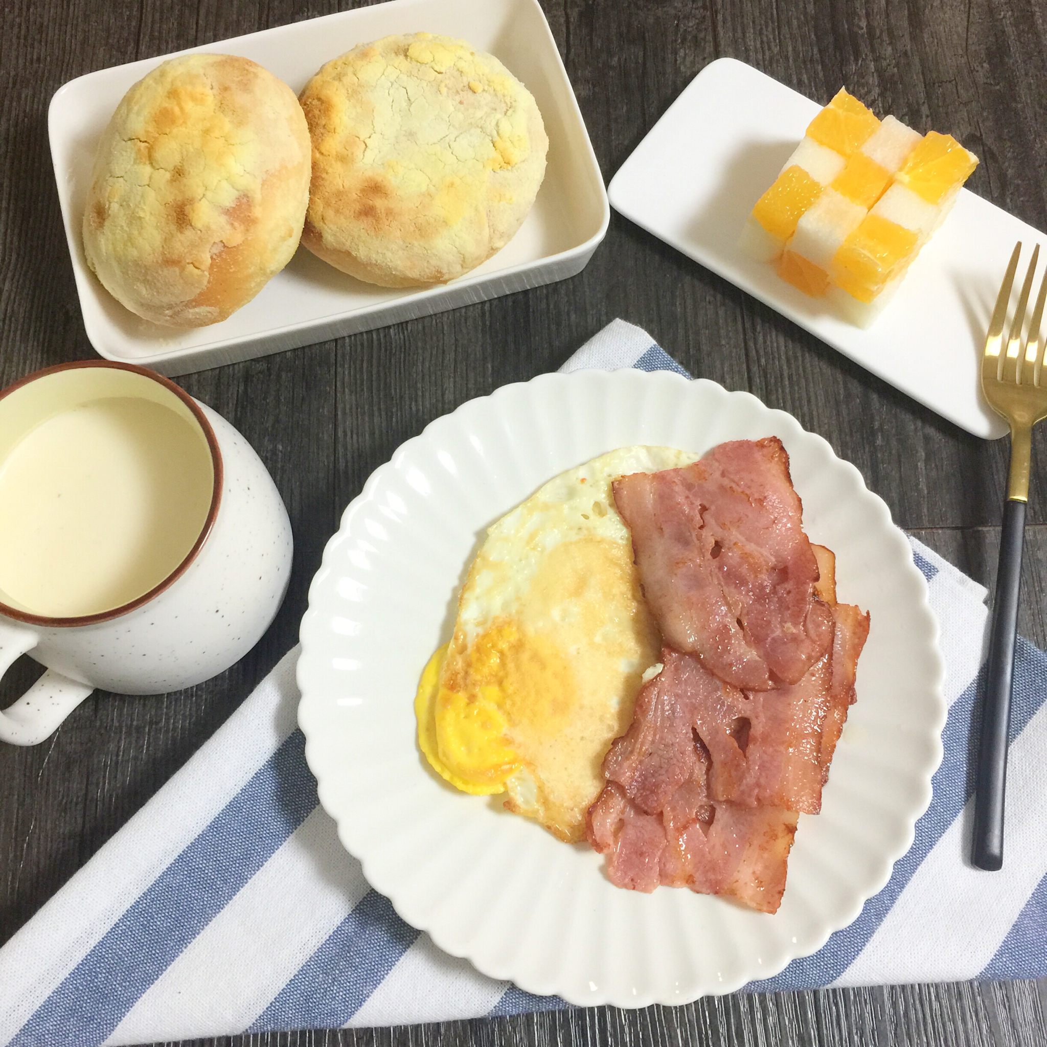 煎蛋、培根、乳酪包、水果、牛奶;PS:乳酪包昨晚做的,早上加热,表面有点黄了[尴尬] #早餐•2015年1...