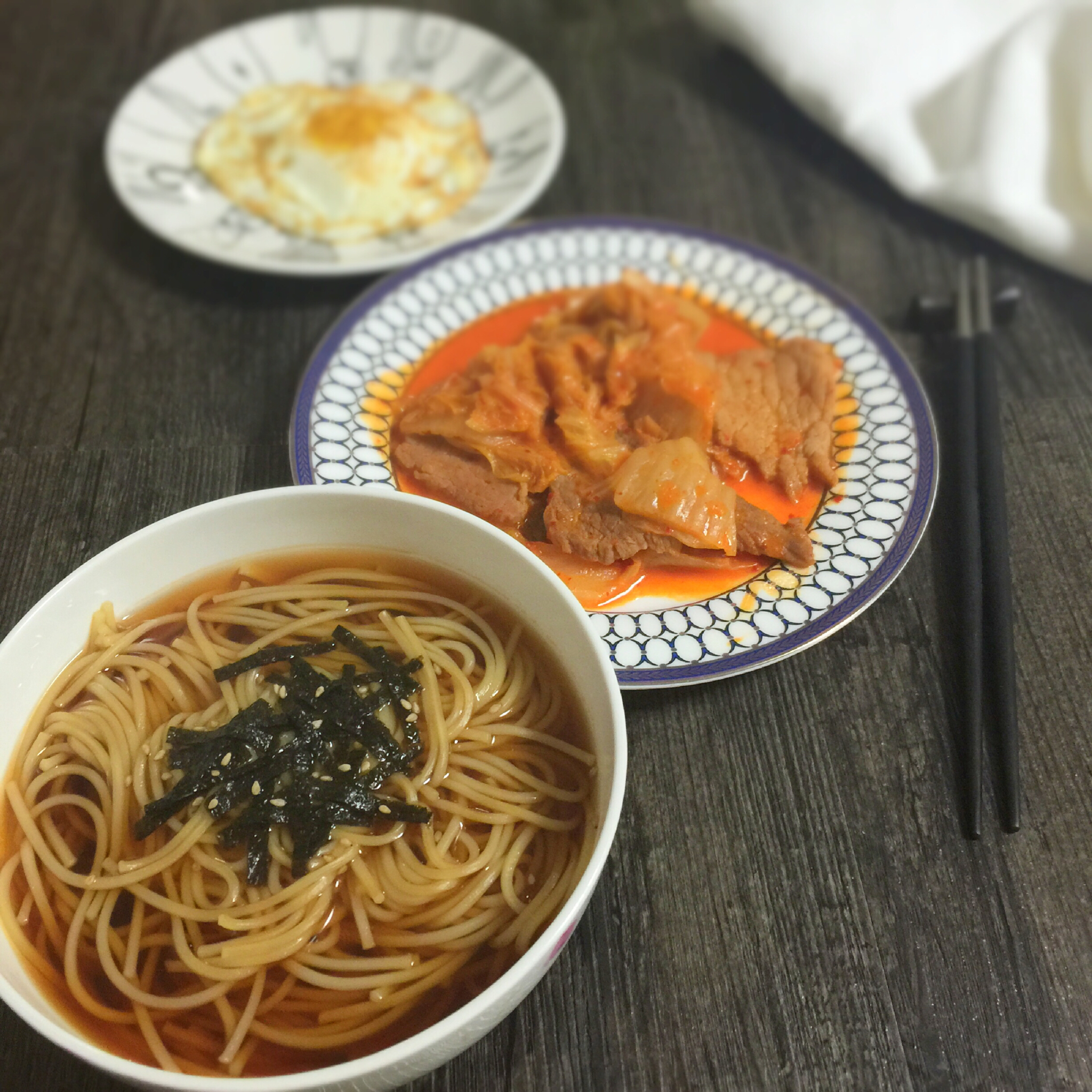 日式拉面、泡菜炒牛肉片、煎荷包蛋