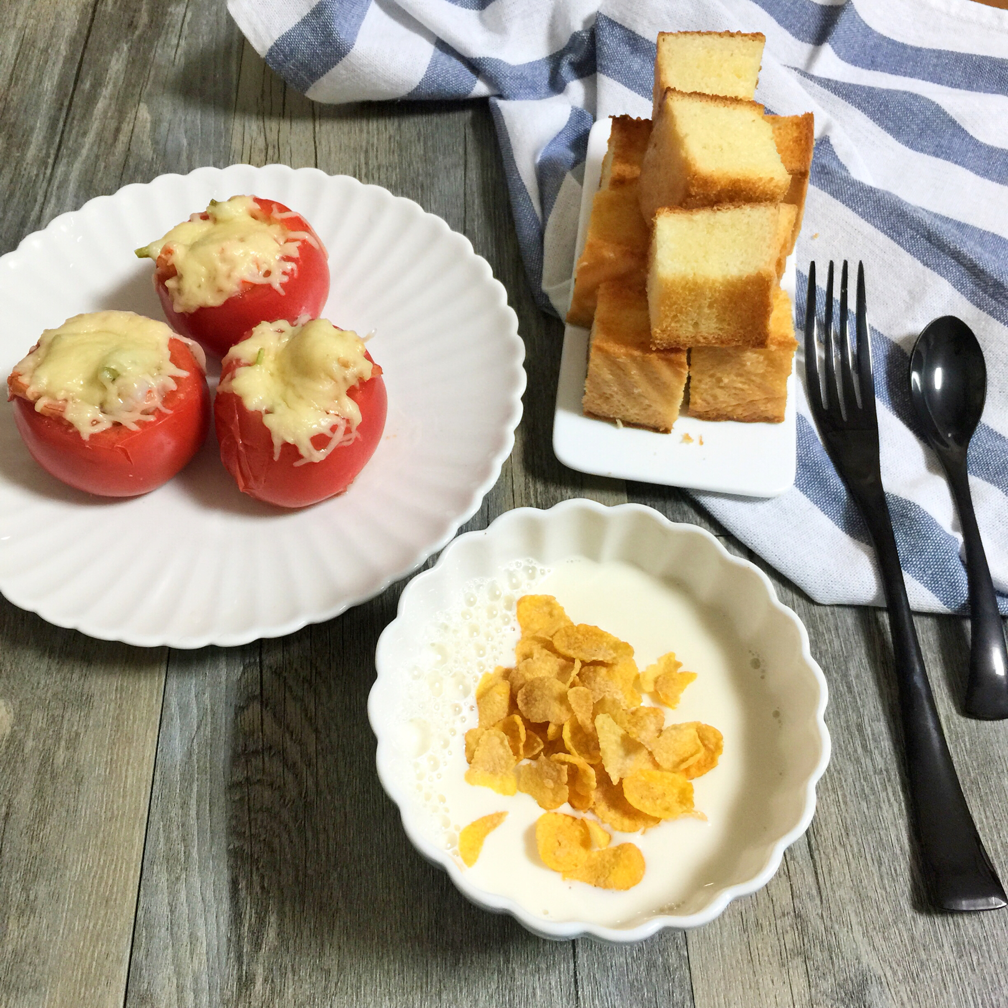 西红柿芝士盅、麦片牛奶、烤吐司