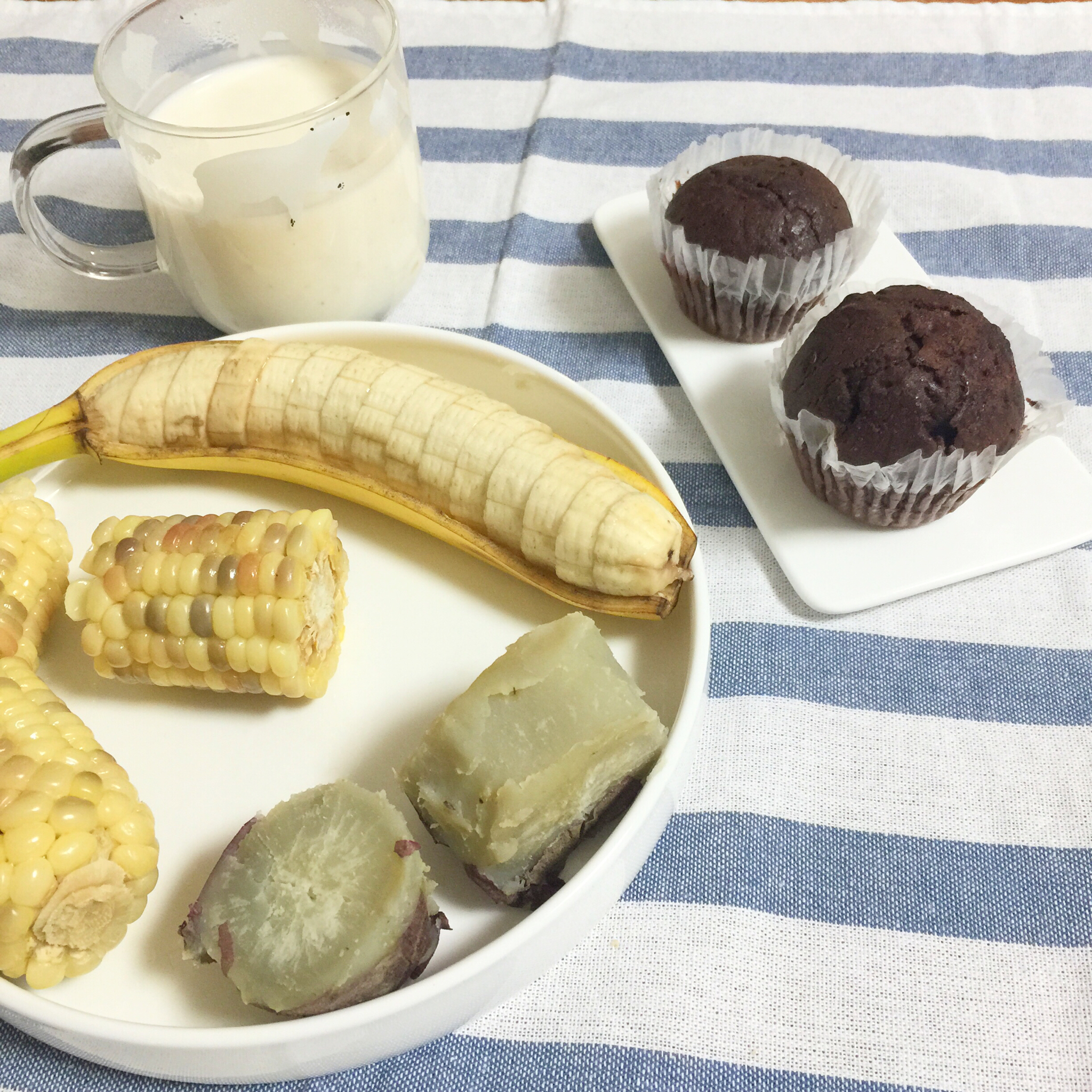 玉米、山芋、香蕉、可可蛋糕、牛奶