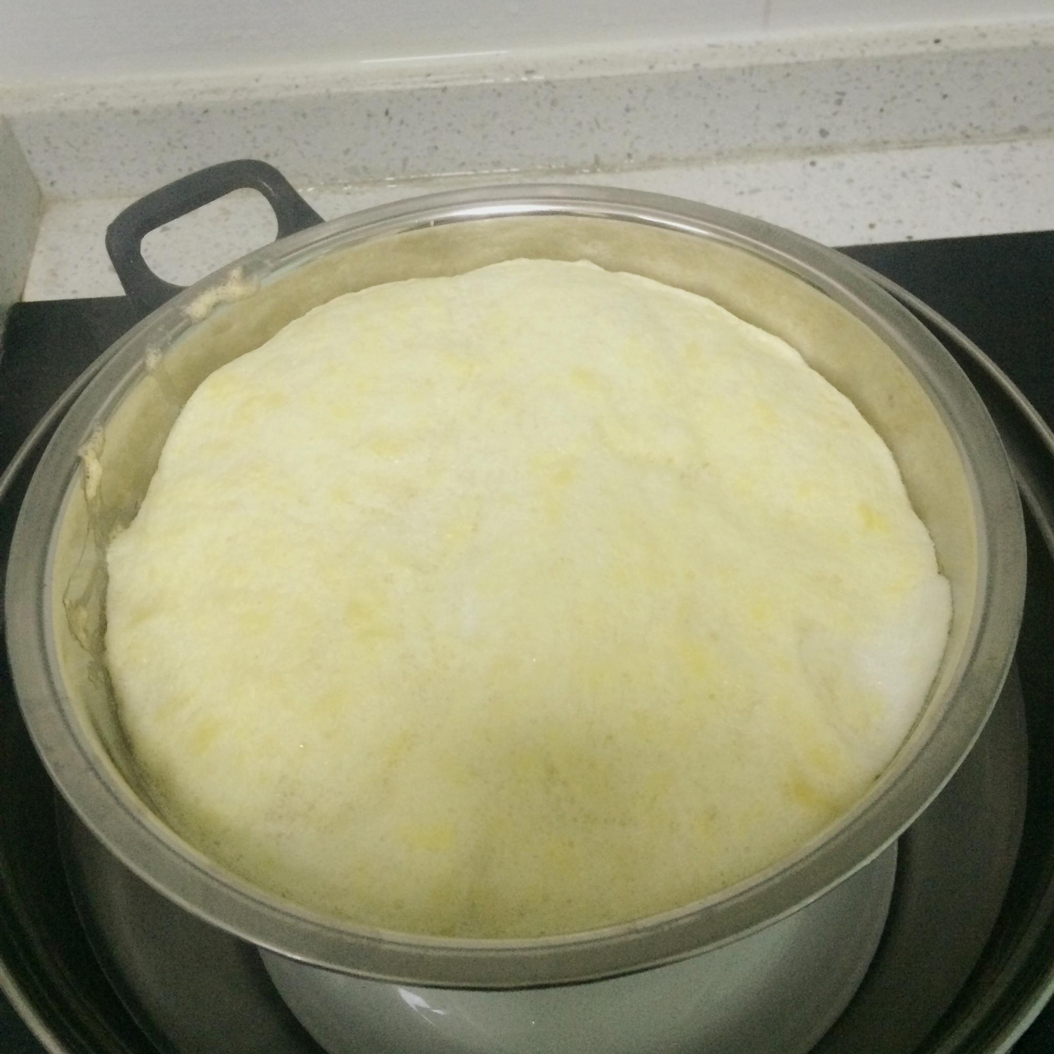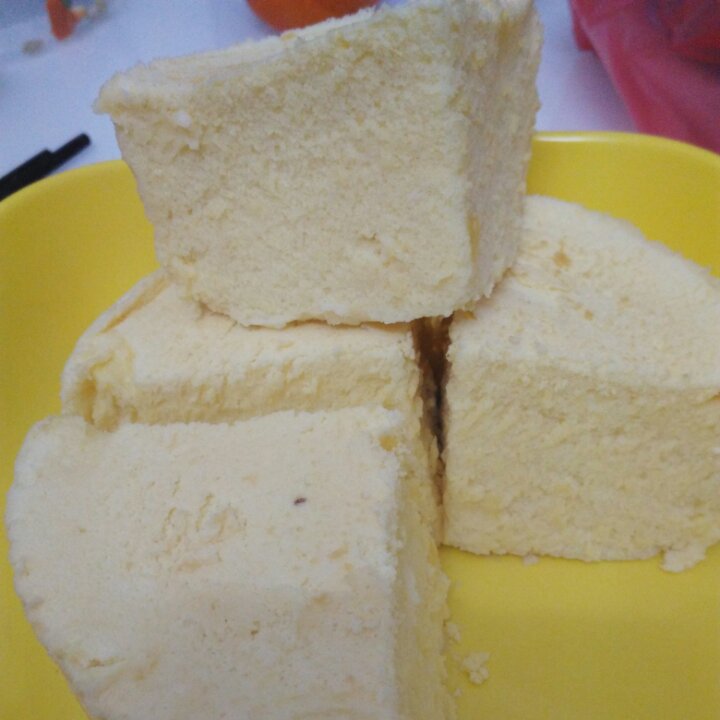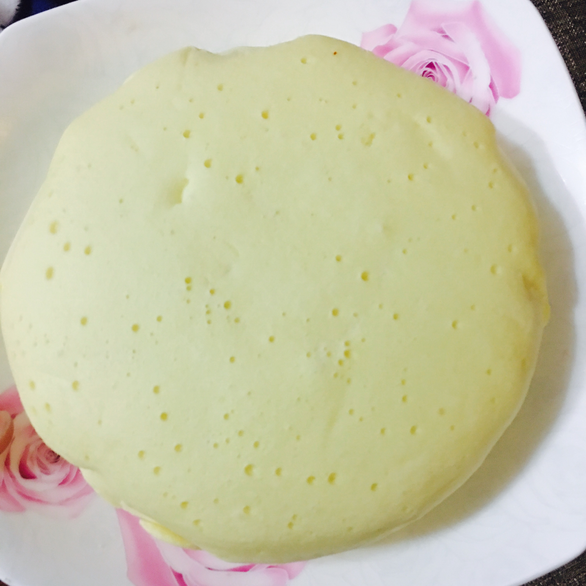 第一次做,发得好高,不回缩。40分钟拿出来后,上面有点稀,又放回锅里蒸了10分钟,看,中间有小泡的地方。自己感觉好完美。...