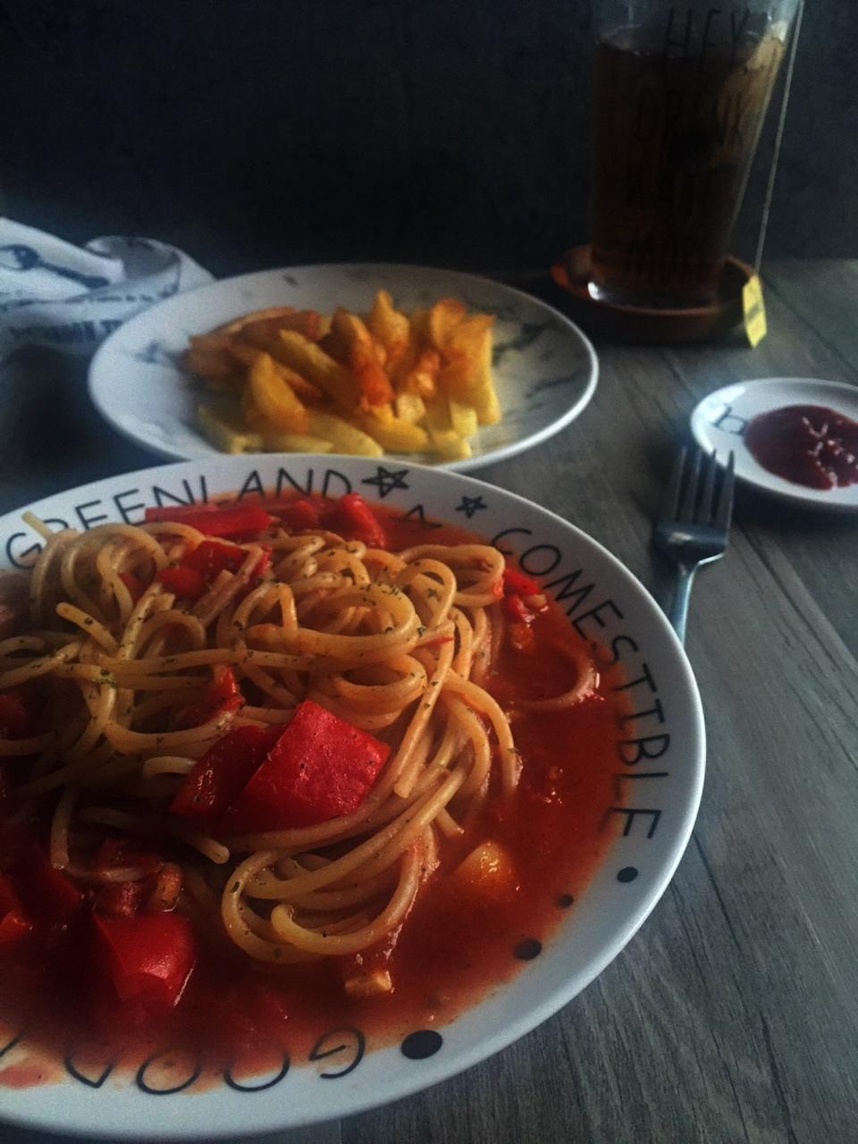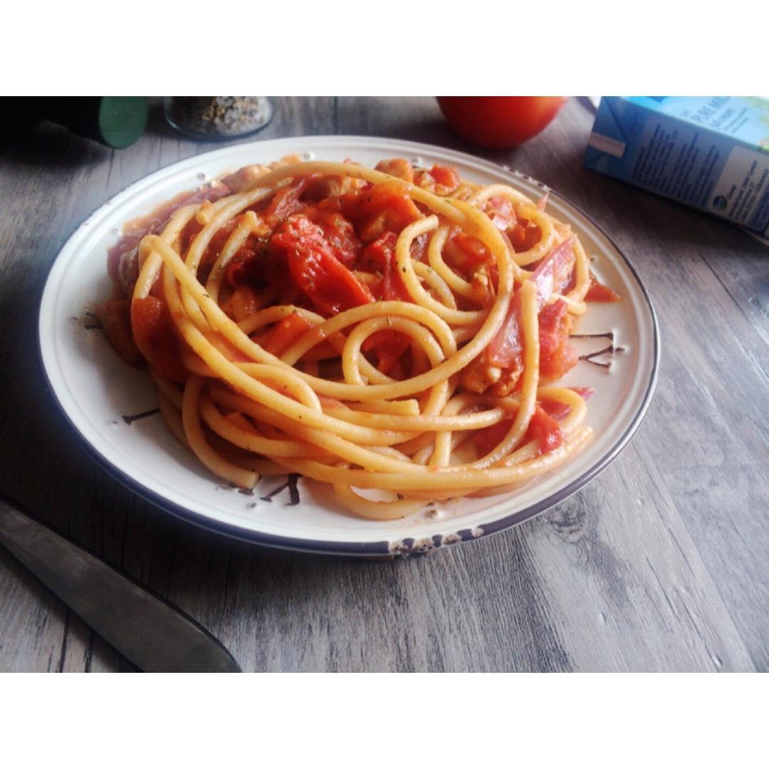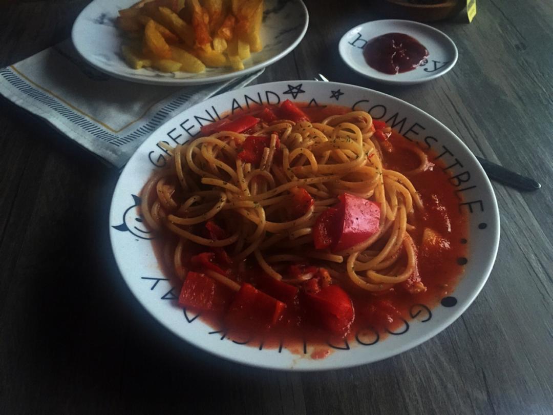 想要尝试不同的意面,前几天买了袋中空的,抓了一把煮过了变成两人份,结果我吃了两碗:)