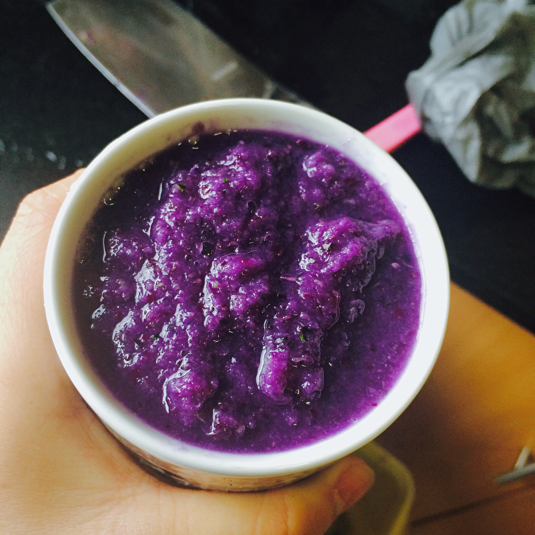 加的苹果和菠萝...罐头-.-说好的嫩嫩玫红呢...紫甘蓝加太多了大概但是喝起来却没有什么味道呢