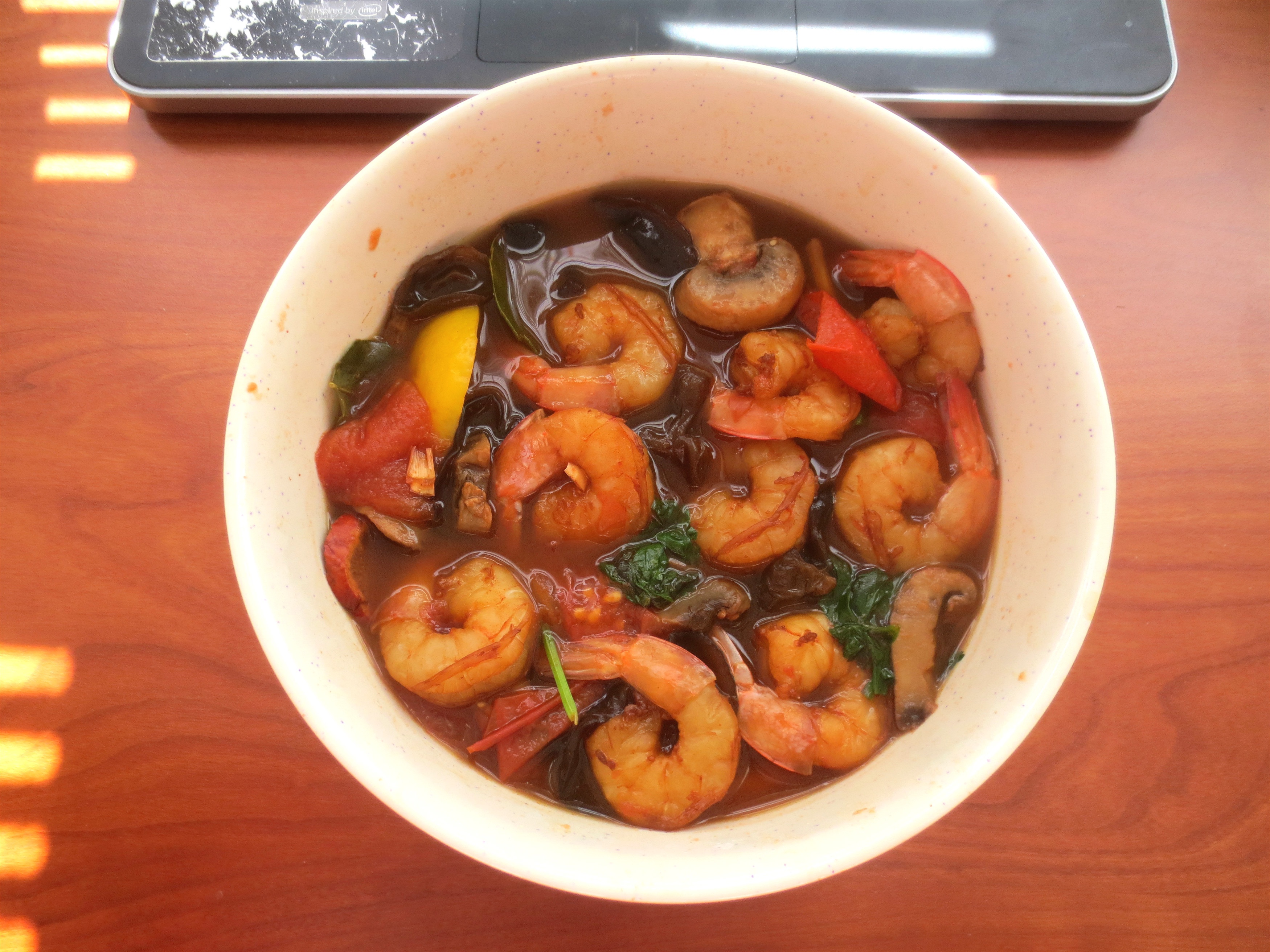 10只虾,两个西红柿;木耳、蘑菇。刚好有柠檬,...
