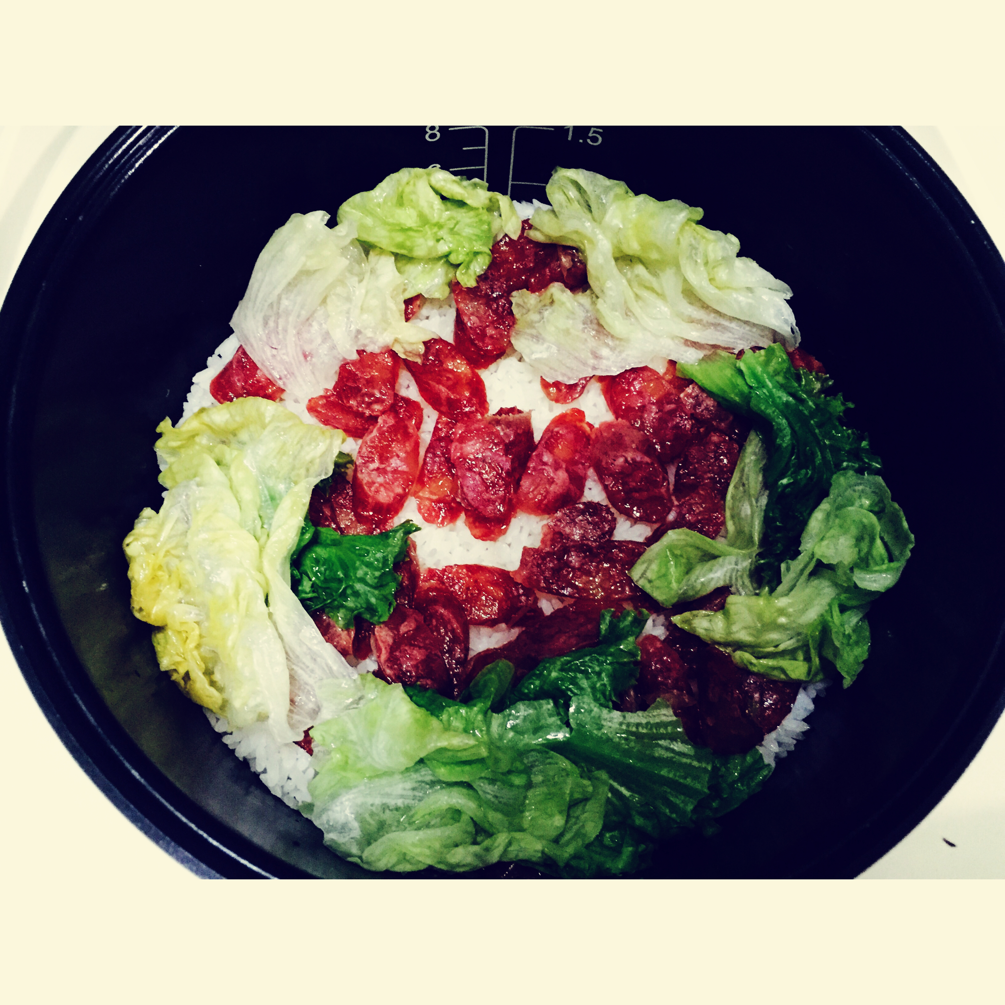 电饭煲版本的腊味煲仔饭。先把米饭蒸到还剩十分钟结束,打开电饭煲放进去切好的广味肠,再还剩两分钟结束,放进去生菜,待米饭蒸...